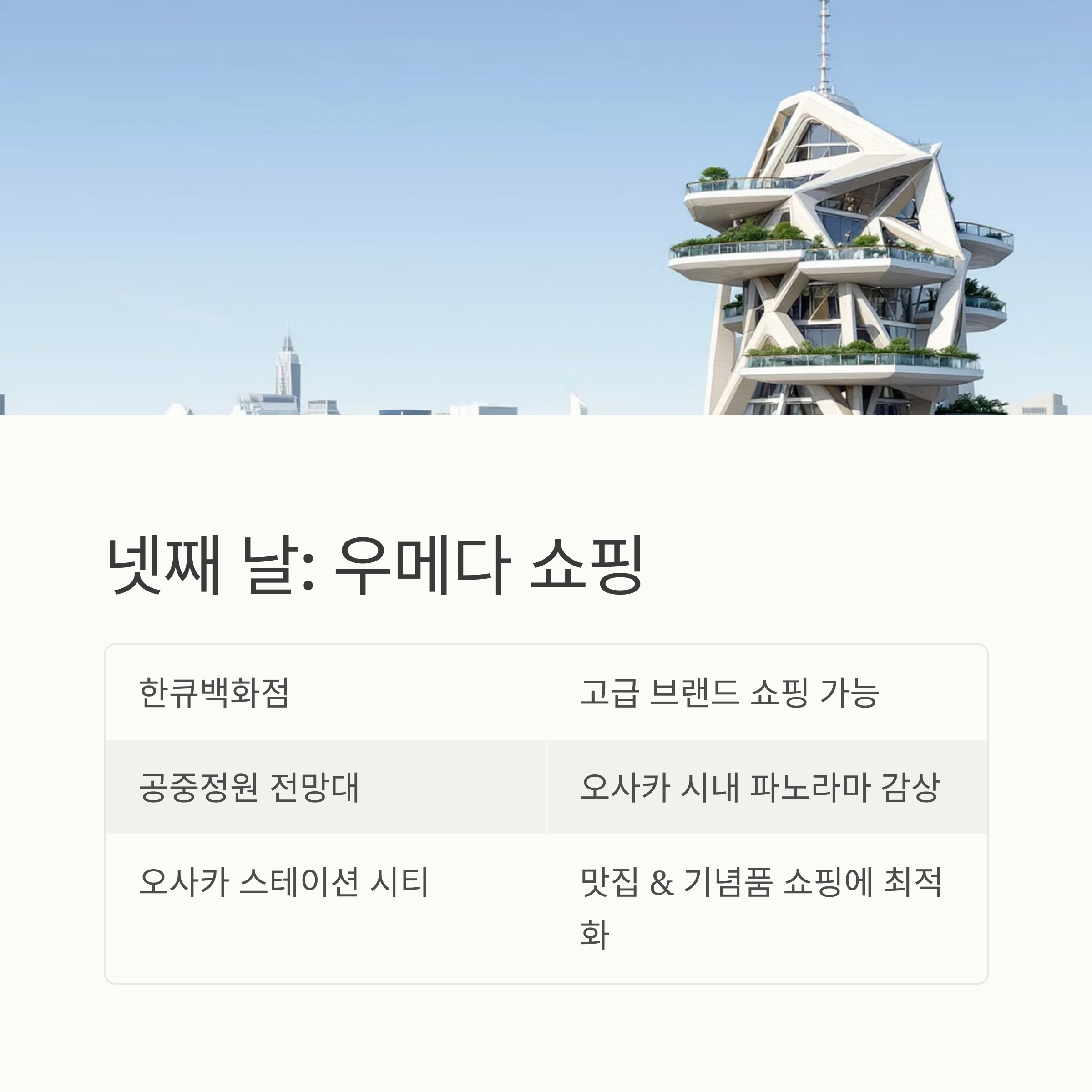 | 4일차 | 오사카 | 우메다 쇼핑, 공항 이동 전 여유 일정 |
