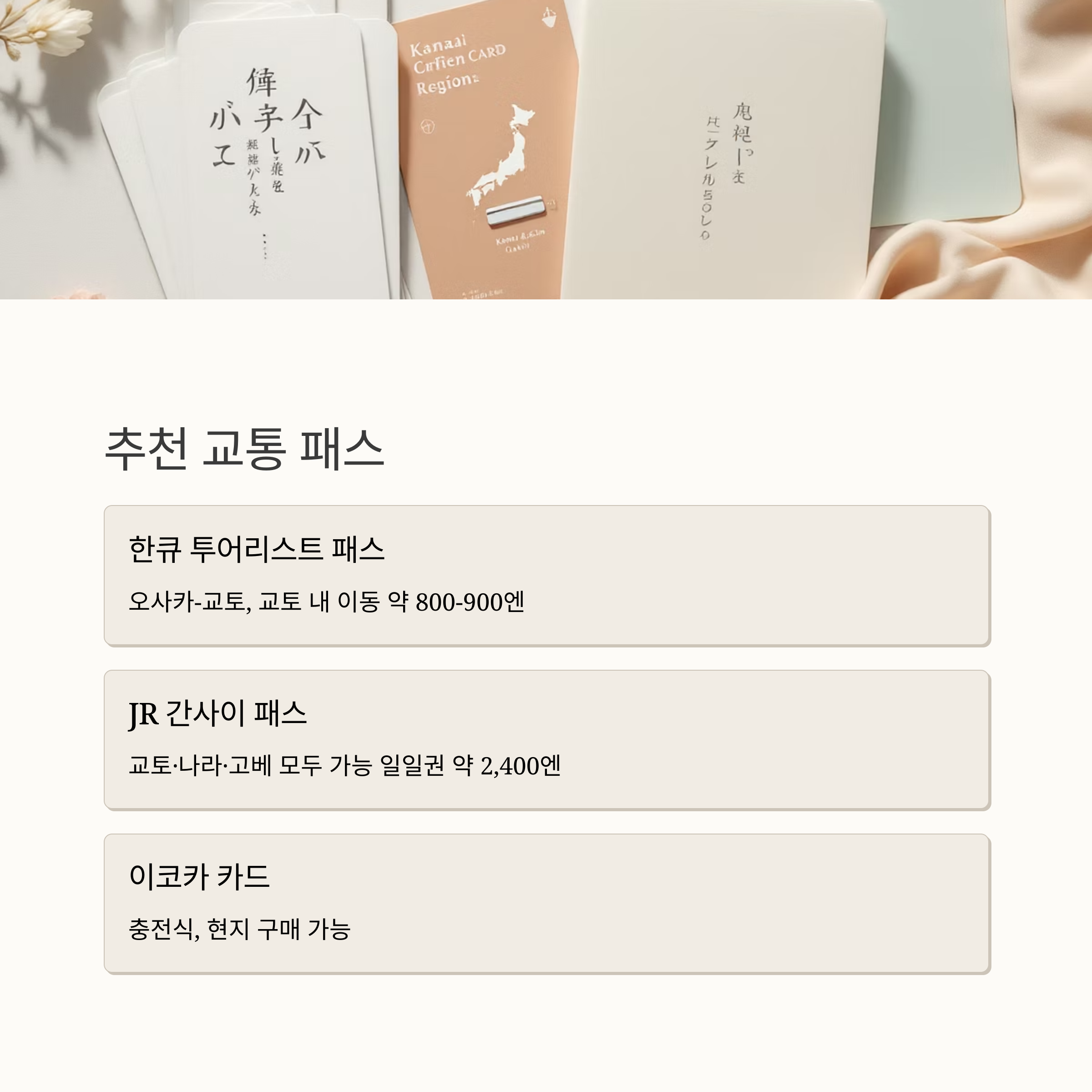 | JR 간사이 패스 | 교토·나라·고베 모두 가능 | 일일권 약 2,400엔 |