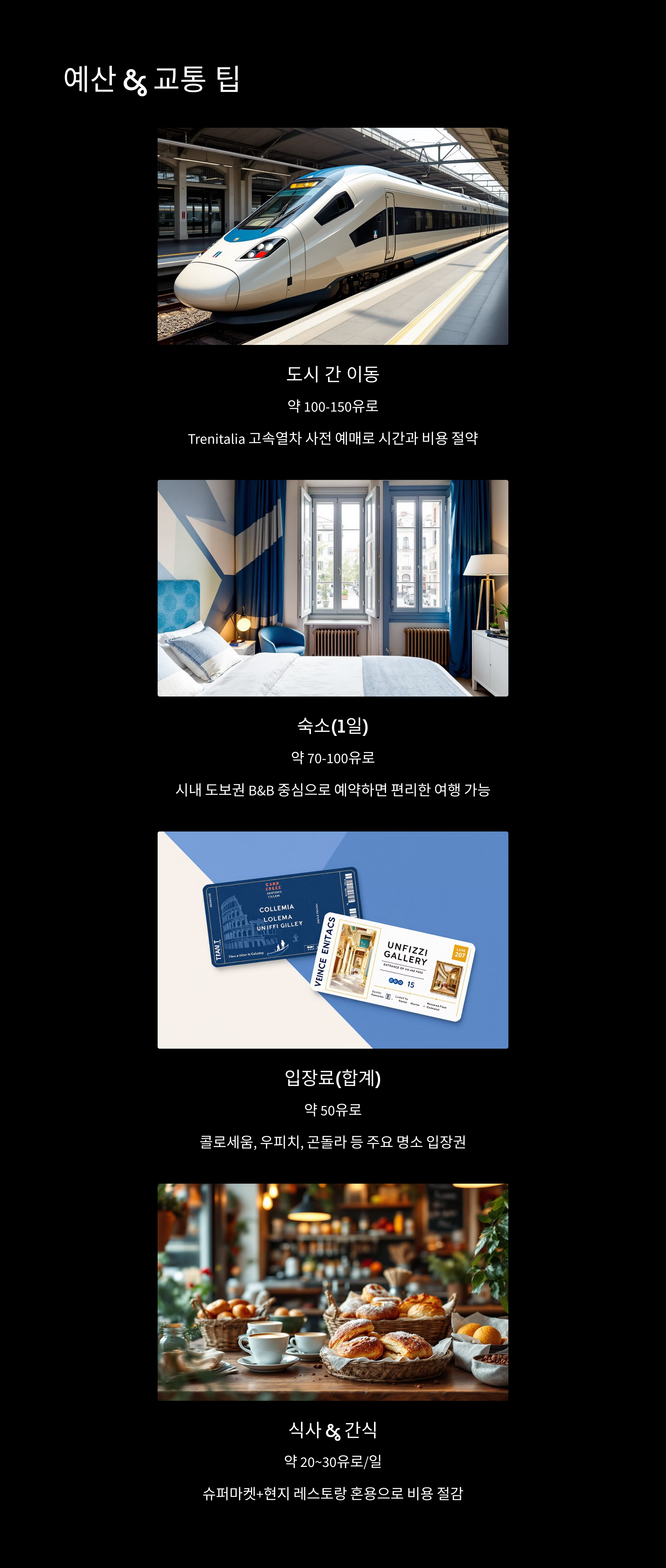 | 도시 간 이동 | 약 100~150유로 | Trenitalia 고속열차 사전 예매 |