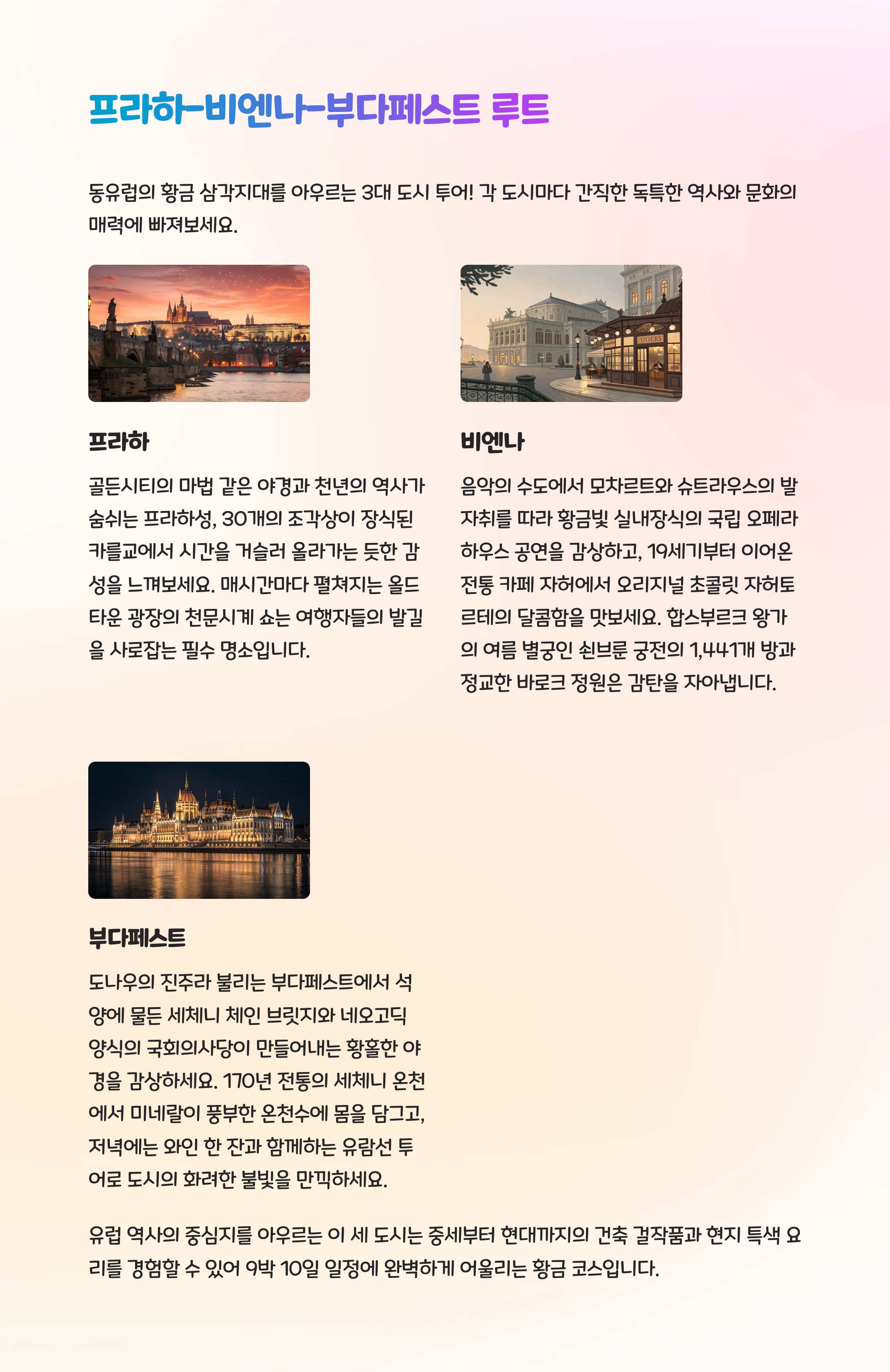 | 프라하~비엔나~부다페스트 | 감성 + 저렴 + 건축 | 약 140~170만원 |