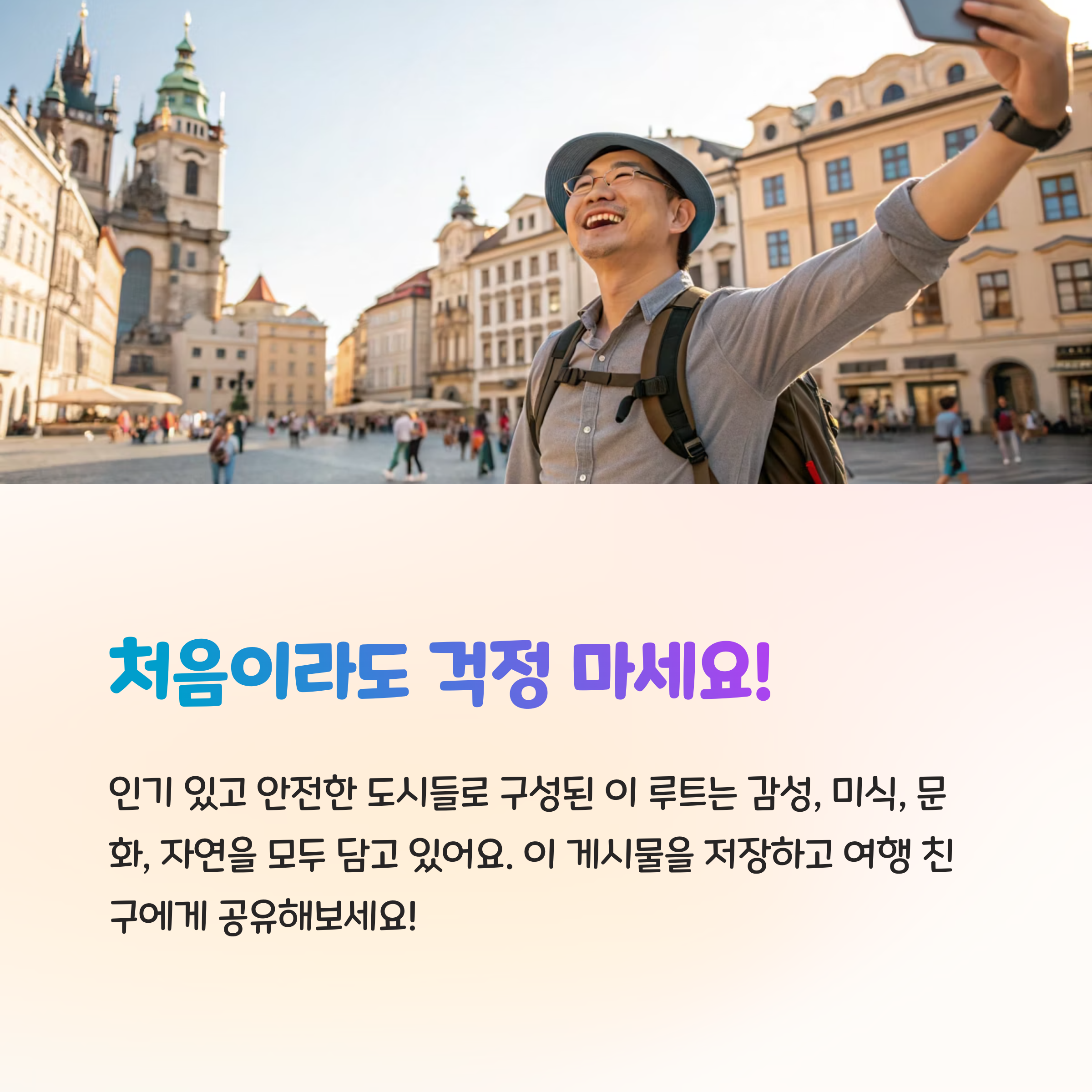 여행을 준비하는 순간부터 이미 설렘이 시작됩니다. 유럽 자유여행은 계획만 잘 세워도 절반은 성공이에요. 오늘 소개한 세 가지 루트는 도시 간 이동이 간편하고, 볼거리와 휴식의 균형도 좋아 초보자에게 특히 추천하는 코스입니다. 파리의 감성, 동유럽의 깊이, 지중해의 자유로움 모두 다른 색깔이지만 어느 루트도 당신의 첫 유럽 여행을 특별하게 만들어줄 거예요. 당신은 어떤 루트를 골라 떠나고 싶으신가요?