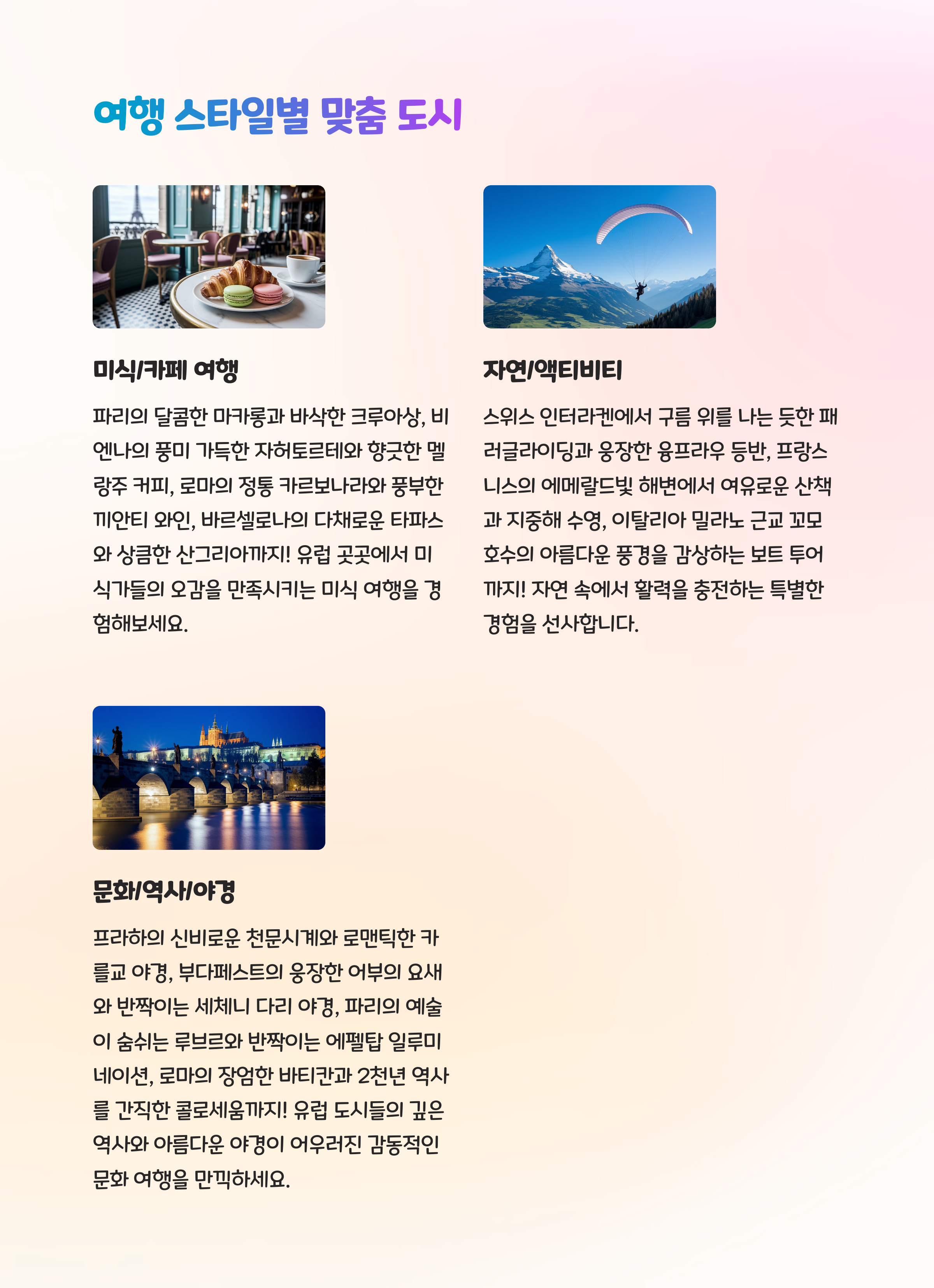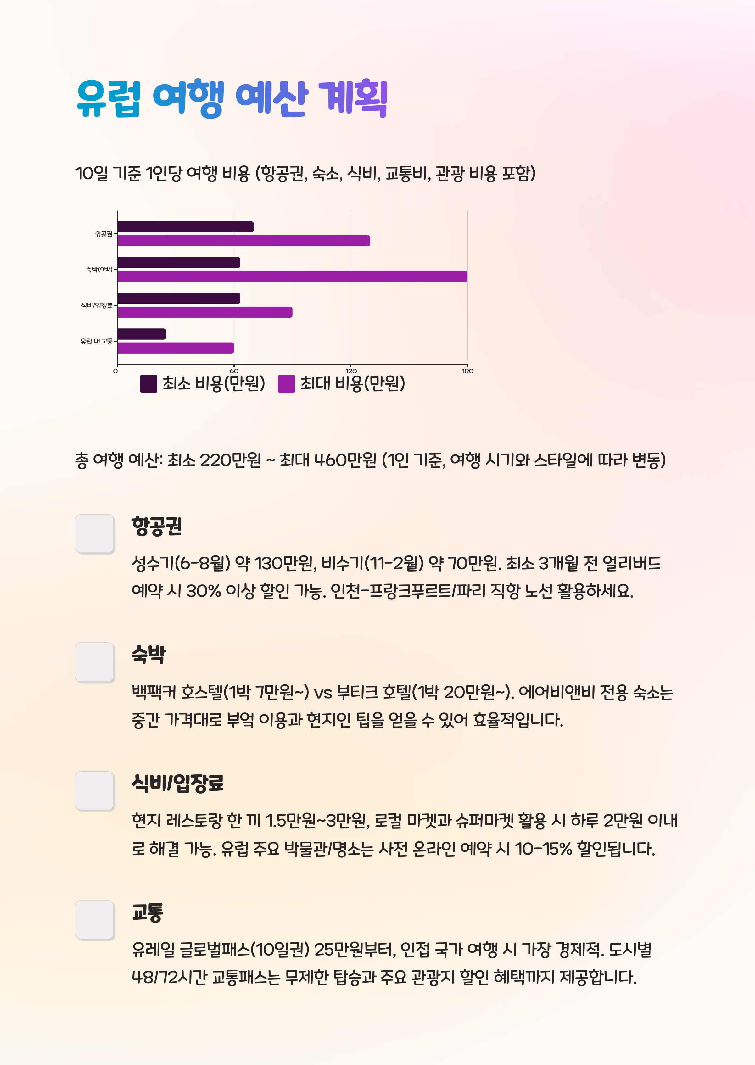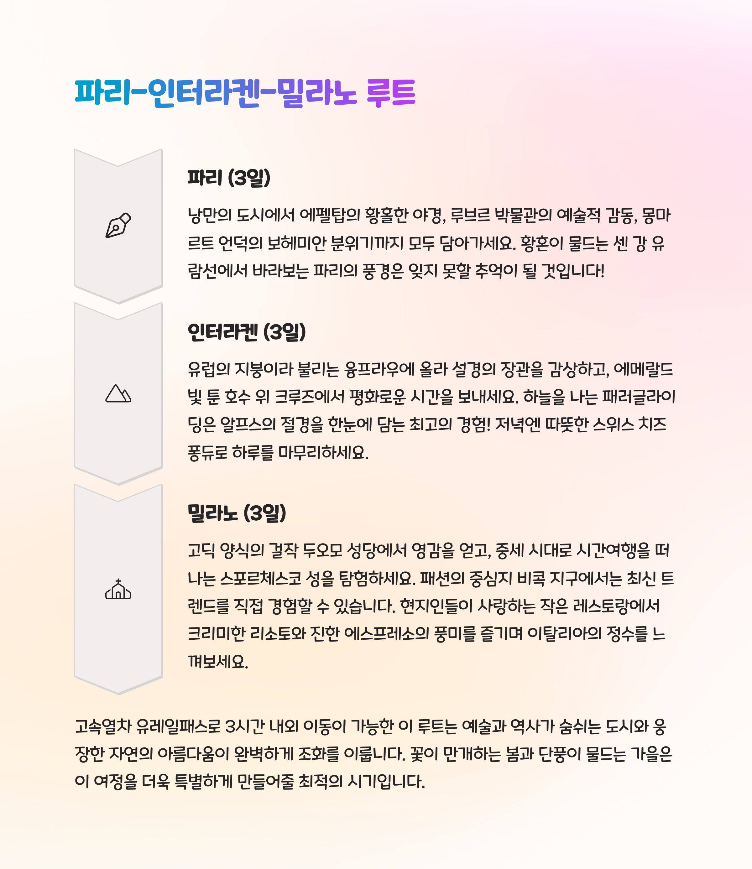 | 파리~인터라켄~밀라노 | 도시 + 자연 + 미식 | 약 180~220만원 |