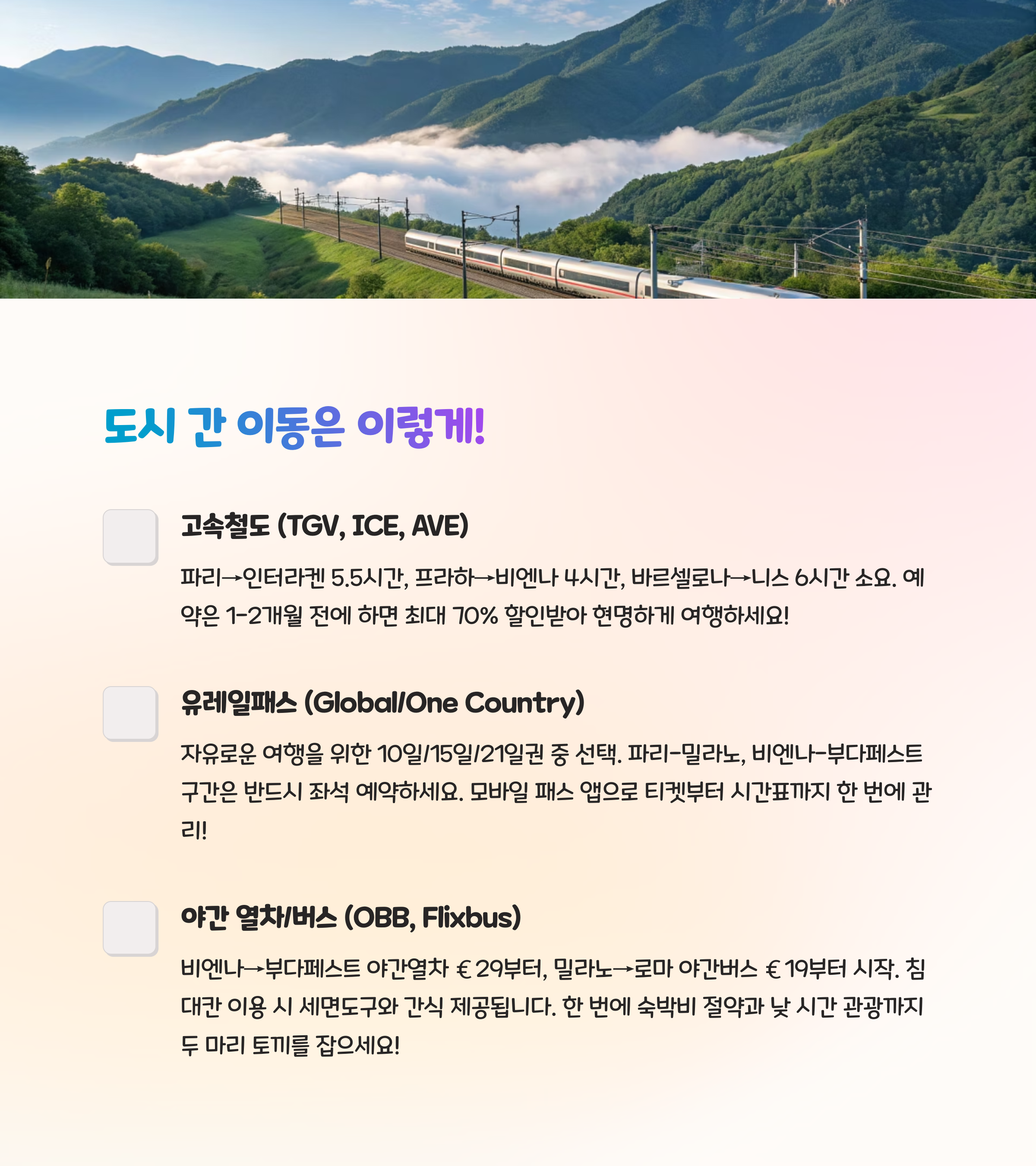 루트 선택은 ‘내가 가장 기대하는 장면’을 기준으로 고르는 걸 추천드려요. 눈 덮인 알프스? 중세 골목? 햇살 아래 해변 산책? 2025년, 당신만의 유럽이 기다리고 있어요.