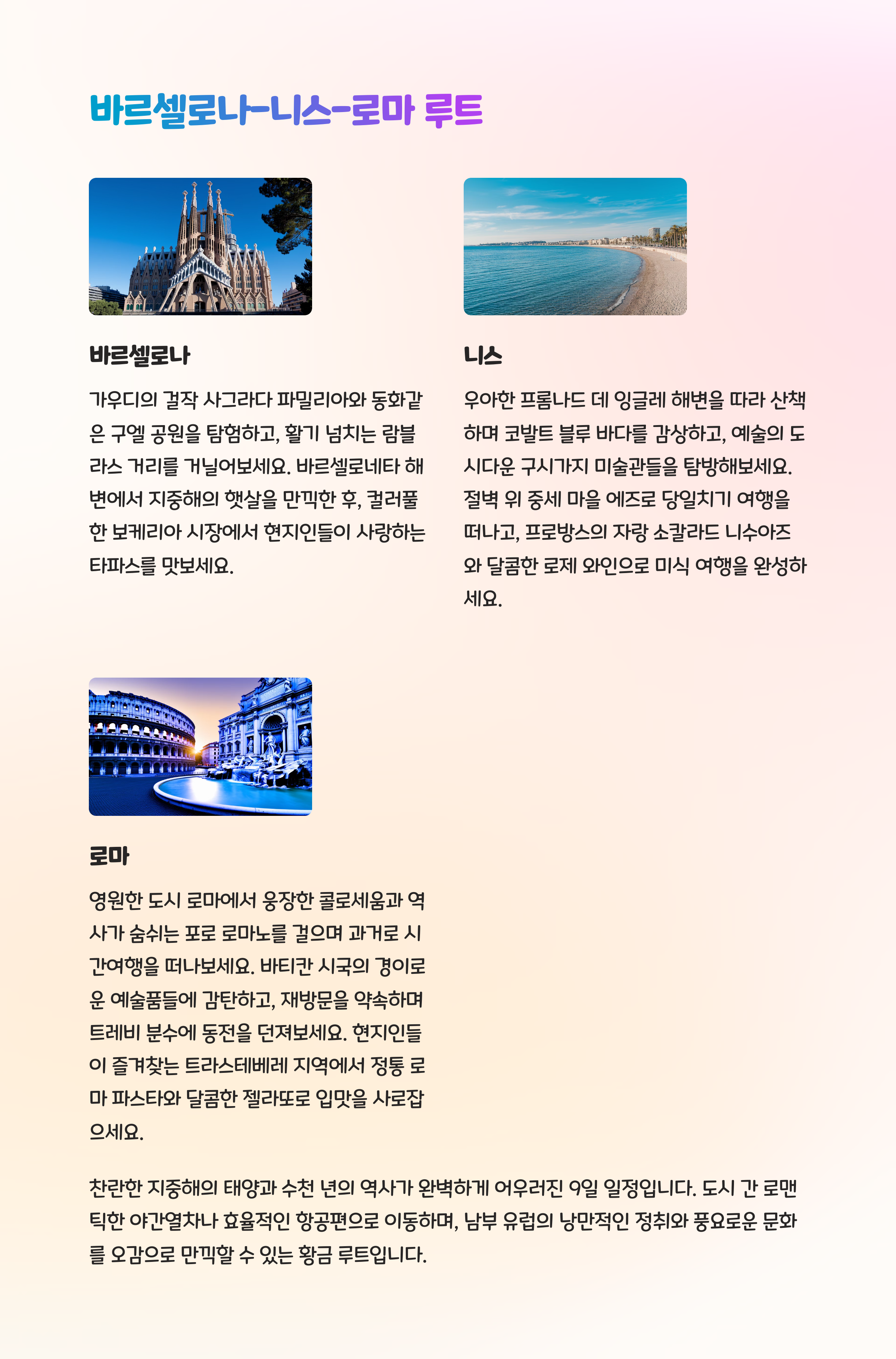 | 바르셀로나~니스~로마 | 해변 + 자유로움 + 사진 | 약 200~240만원 |