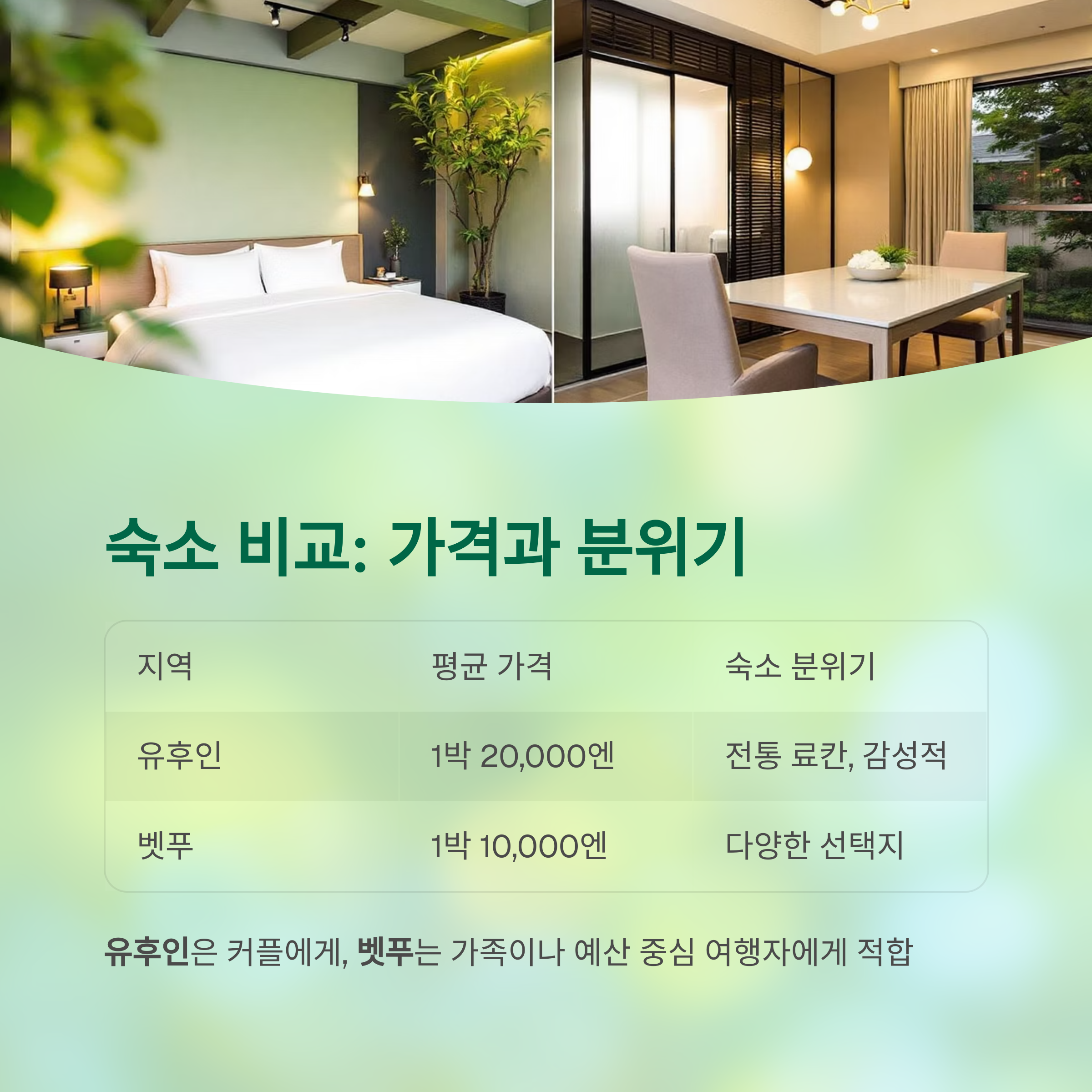 | 유후인 | 1박 20,000엔 내외 | 전통 료칸, 감성적 분위기 |