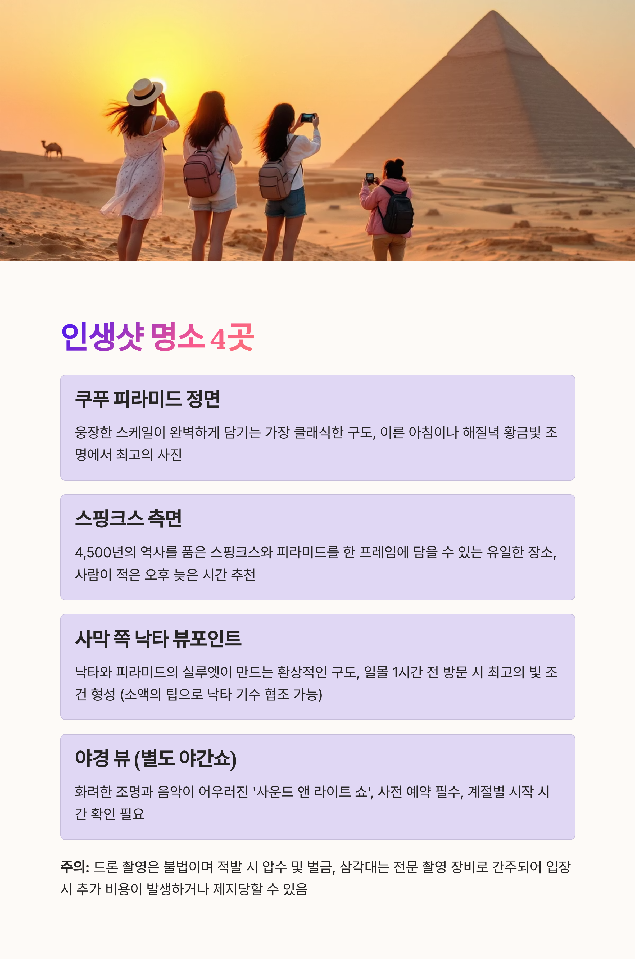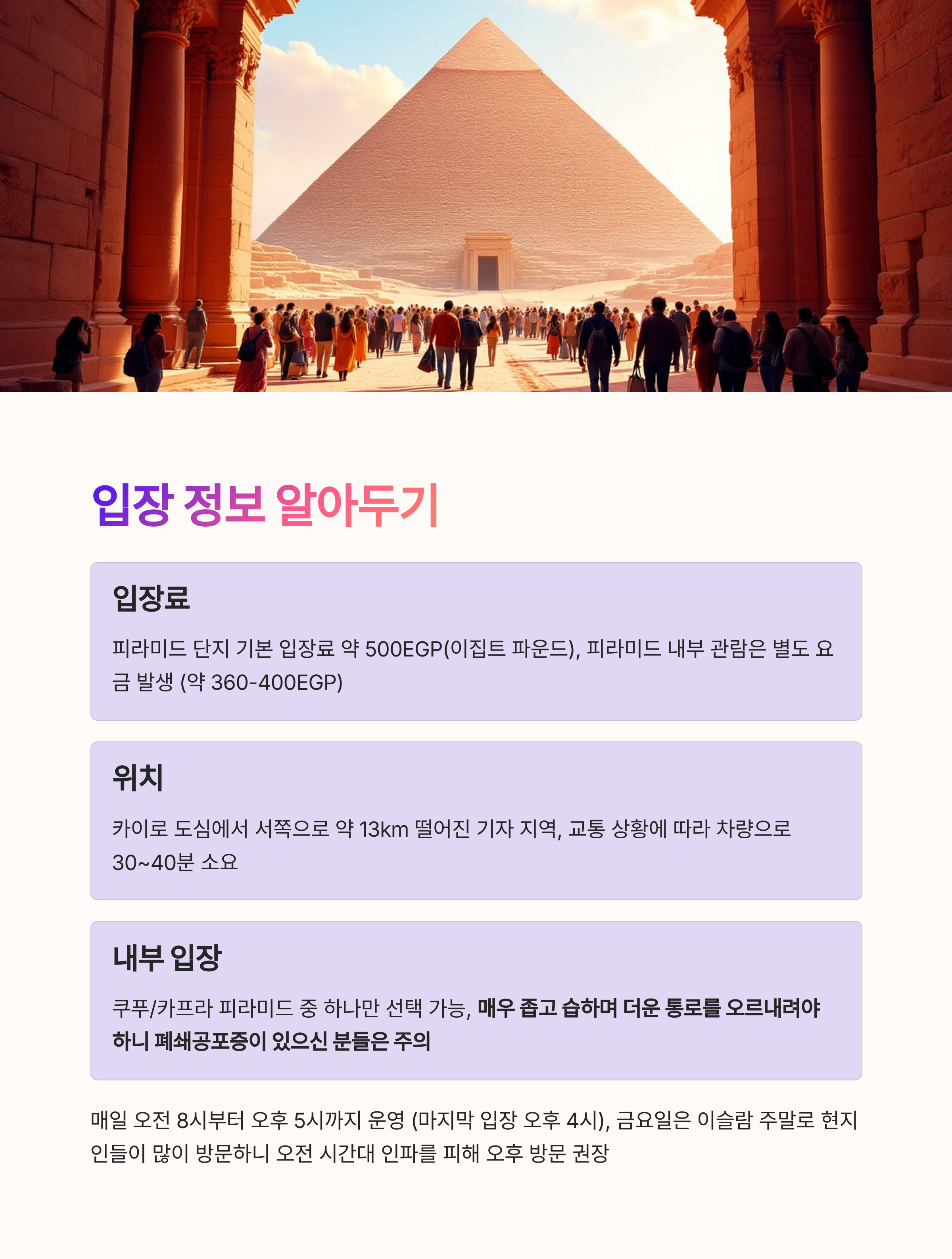 | 입장료 | 피라미드 지역 약 500EGP, 내부 입장 별도 유료 |
