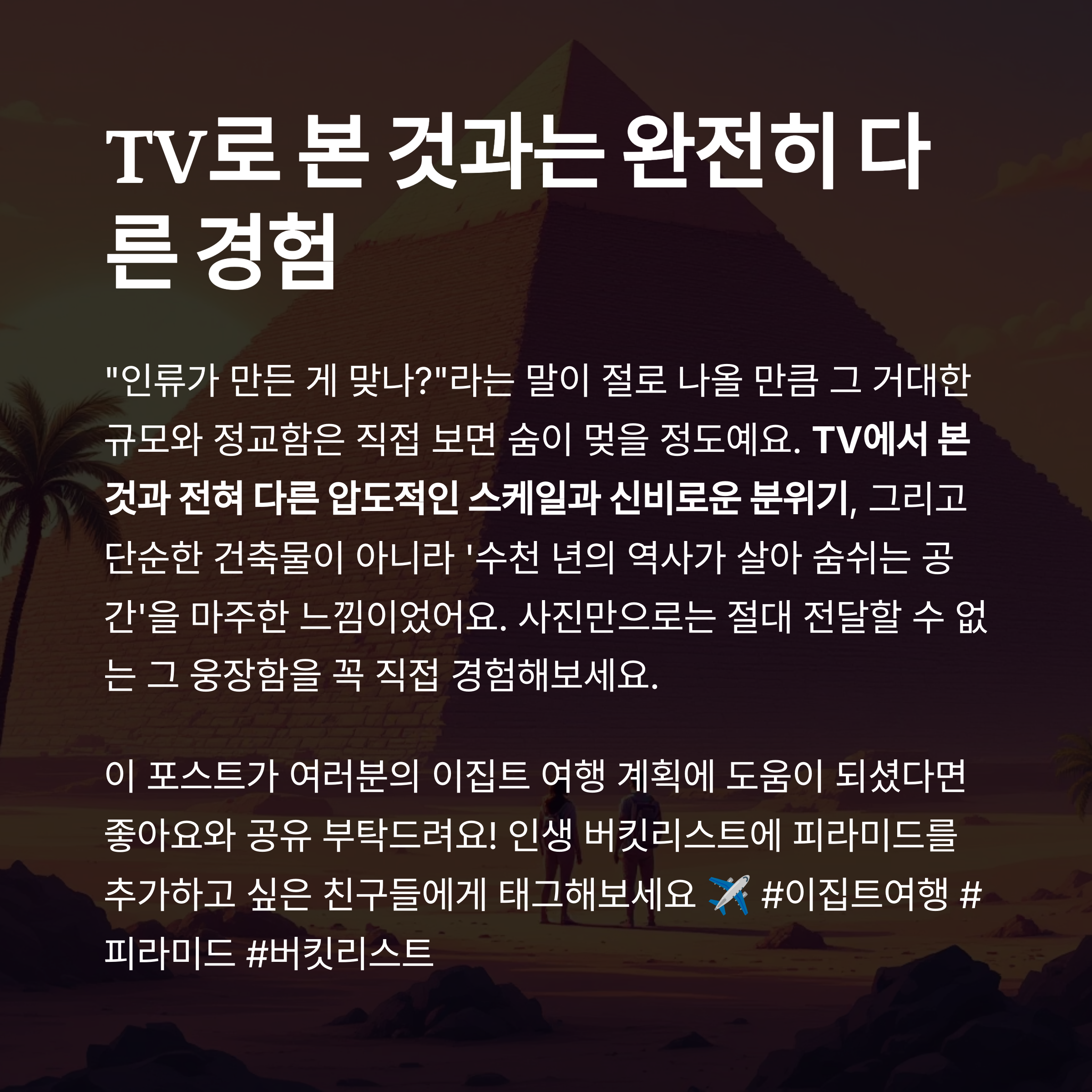이번 글에서는 피라미드 투어의 구성, 방문 시 유의사항, 실감 후기까지