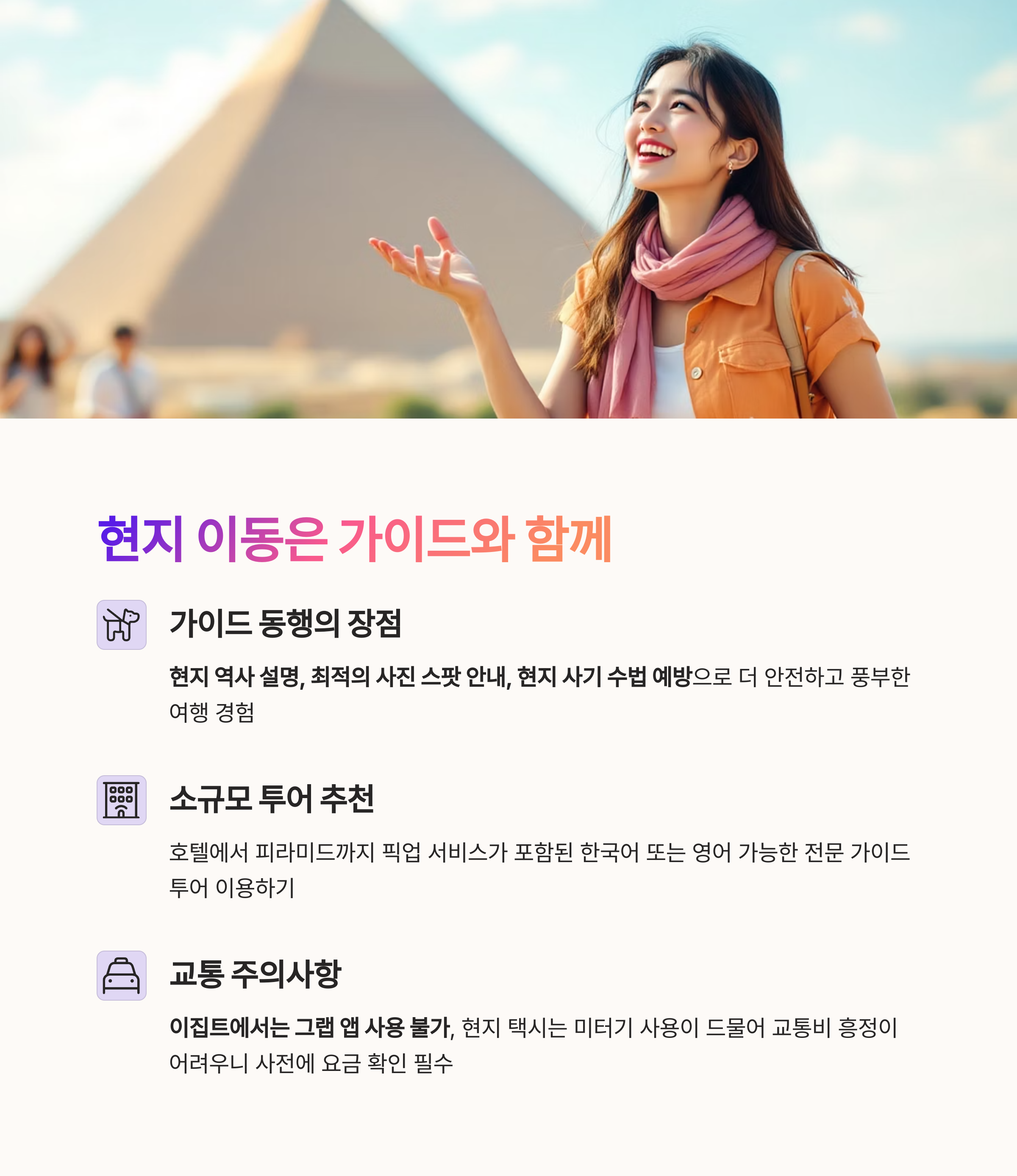 - 가이드 동행 시 설명+사진 스팟 안내+흔한 사기 예방 가능