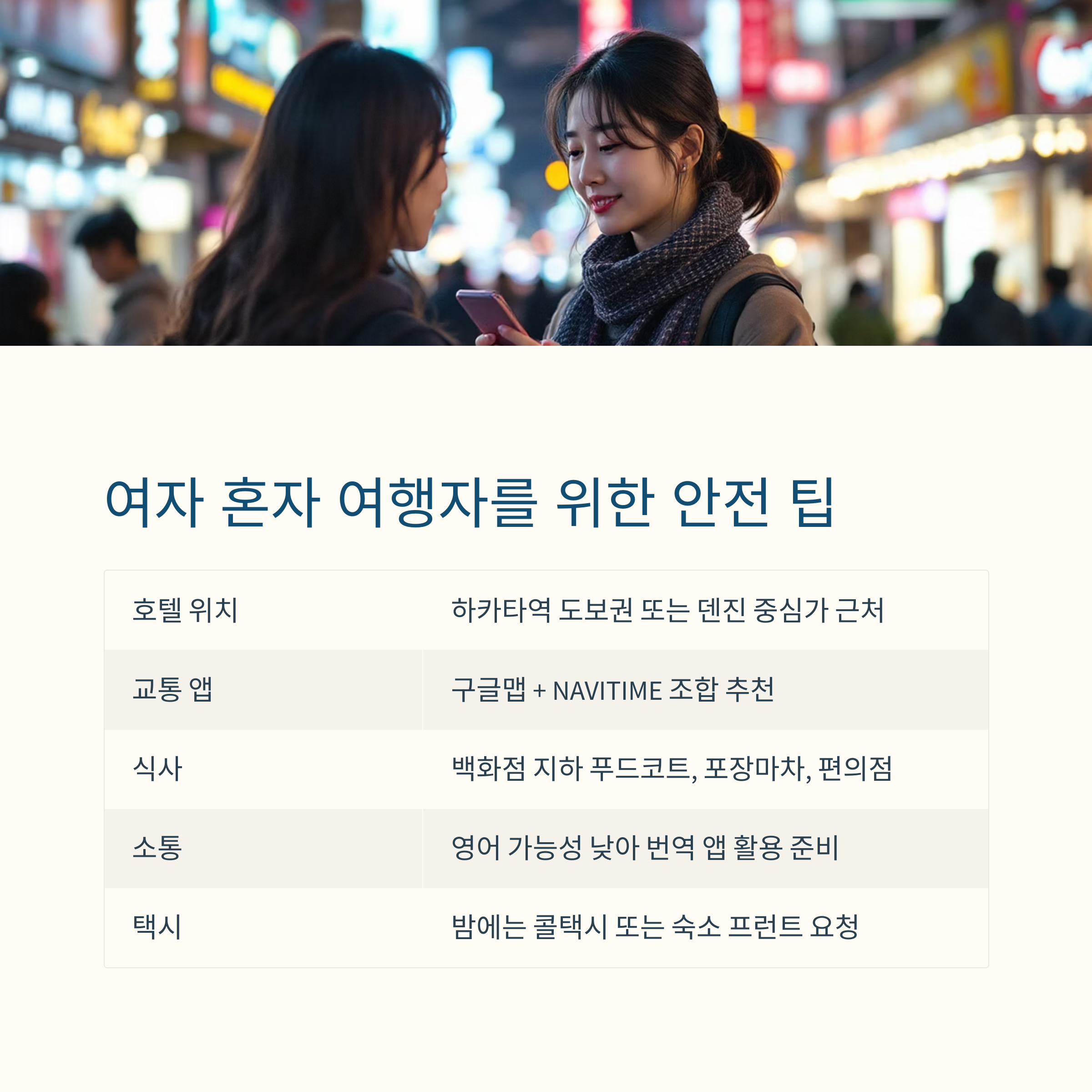 | 혼자 택시 | 밤 시간대엔 콜택시 또는 숙소 프런트 요청 권장 |