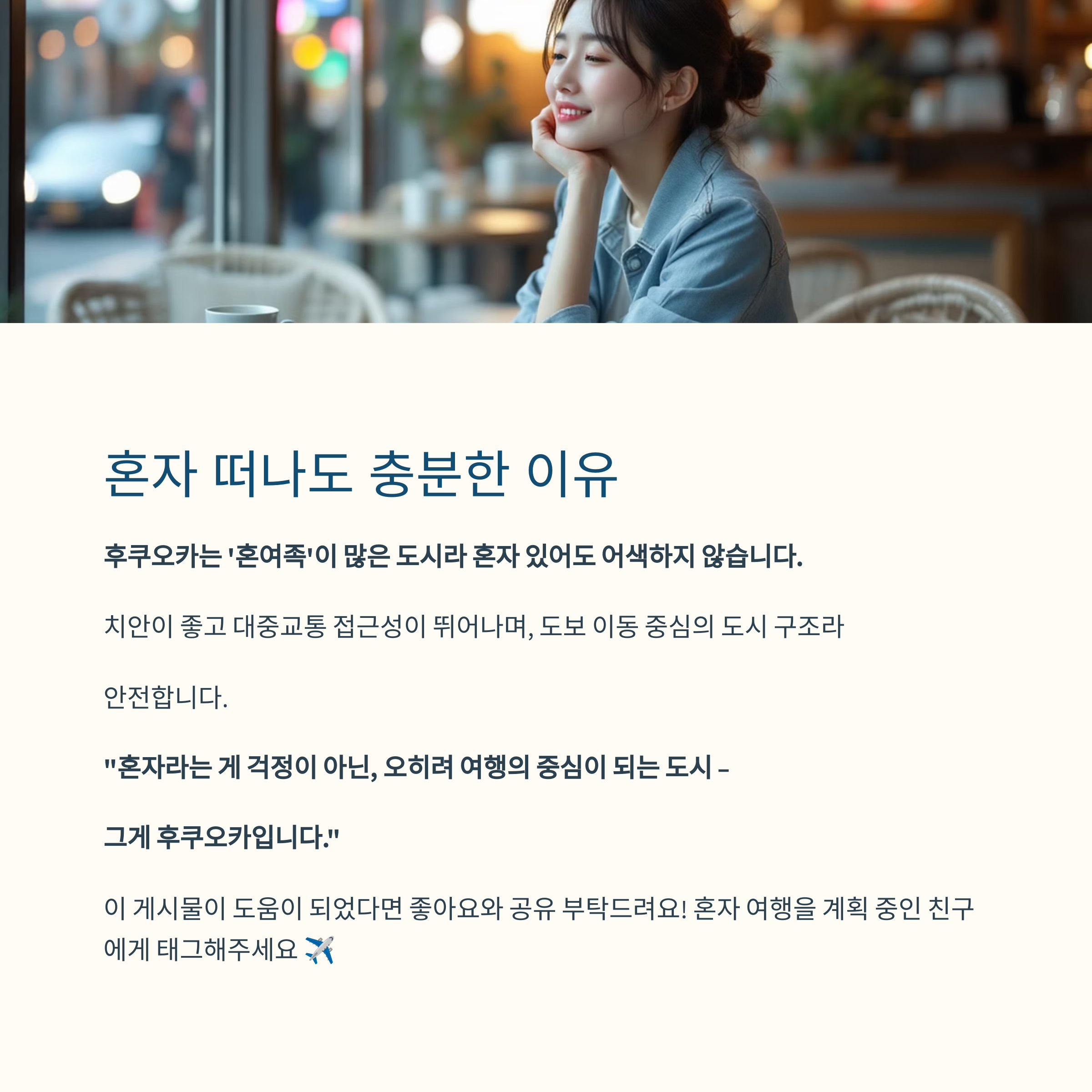 "혼자라는 게 걱정이 아닌, 오히려 여행의 중심이 되는 도시 – 그게 후쿠오카입니다."