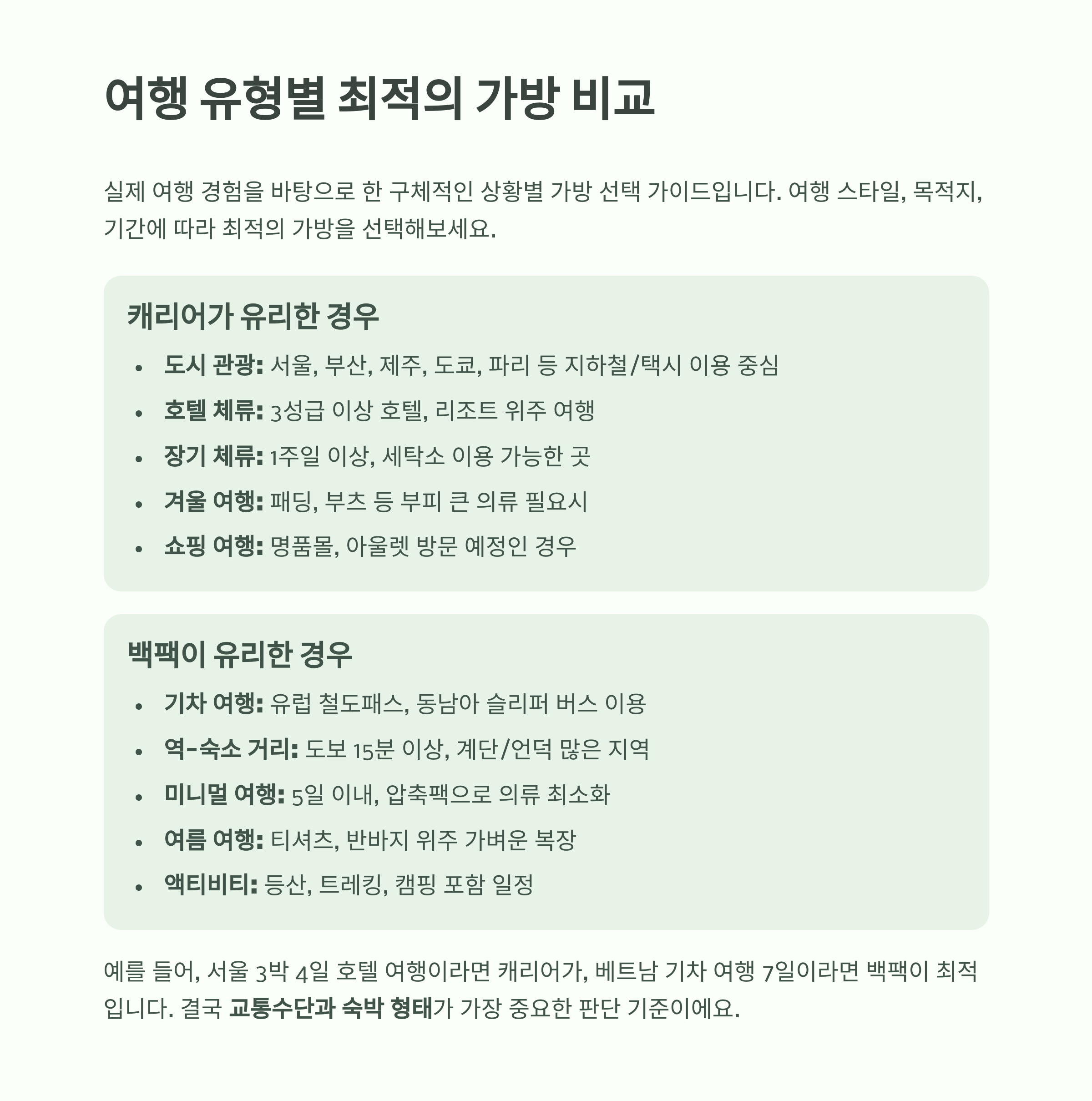 | 여행 유형 | 캐리어 유리한 경우 | 백팩 유리한 경우 |