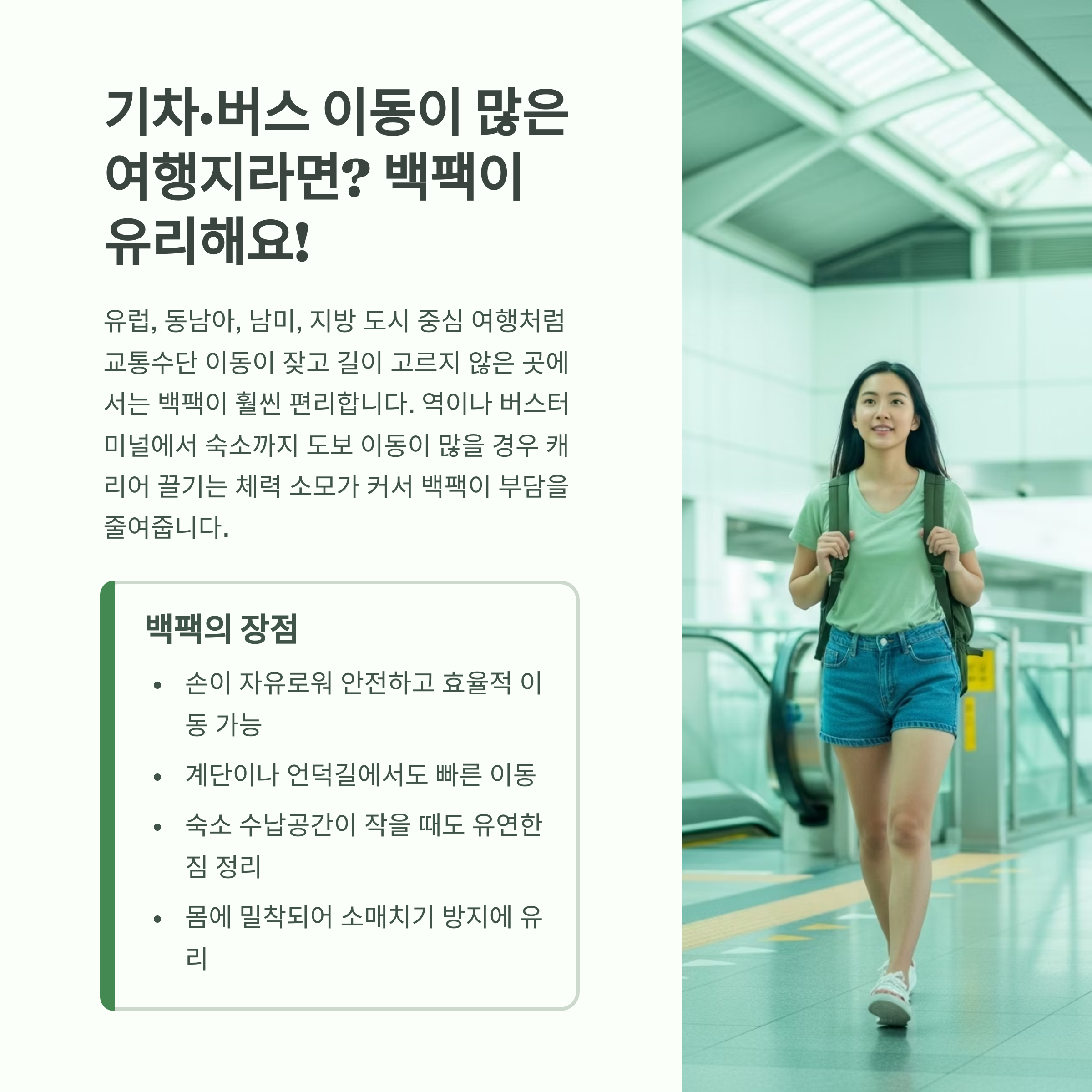 | 장거리 이동 | 항공편 수하물 이용 시 안정적 | 기차·버스 위주, 자주 이동하는 여행 |