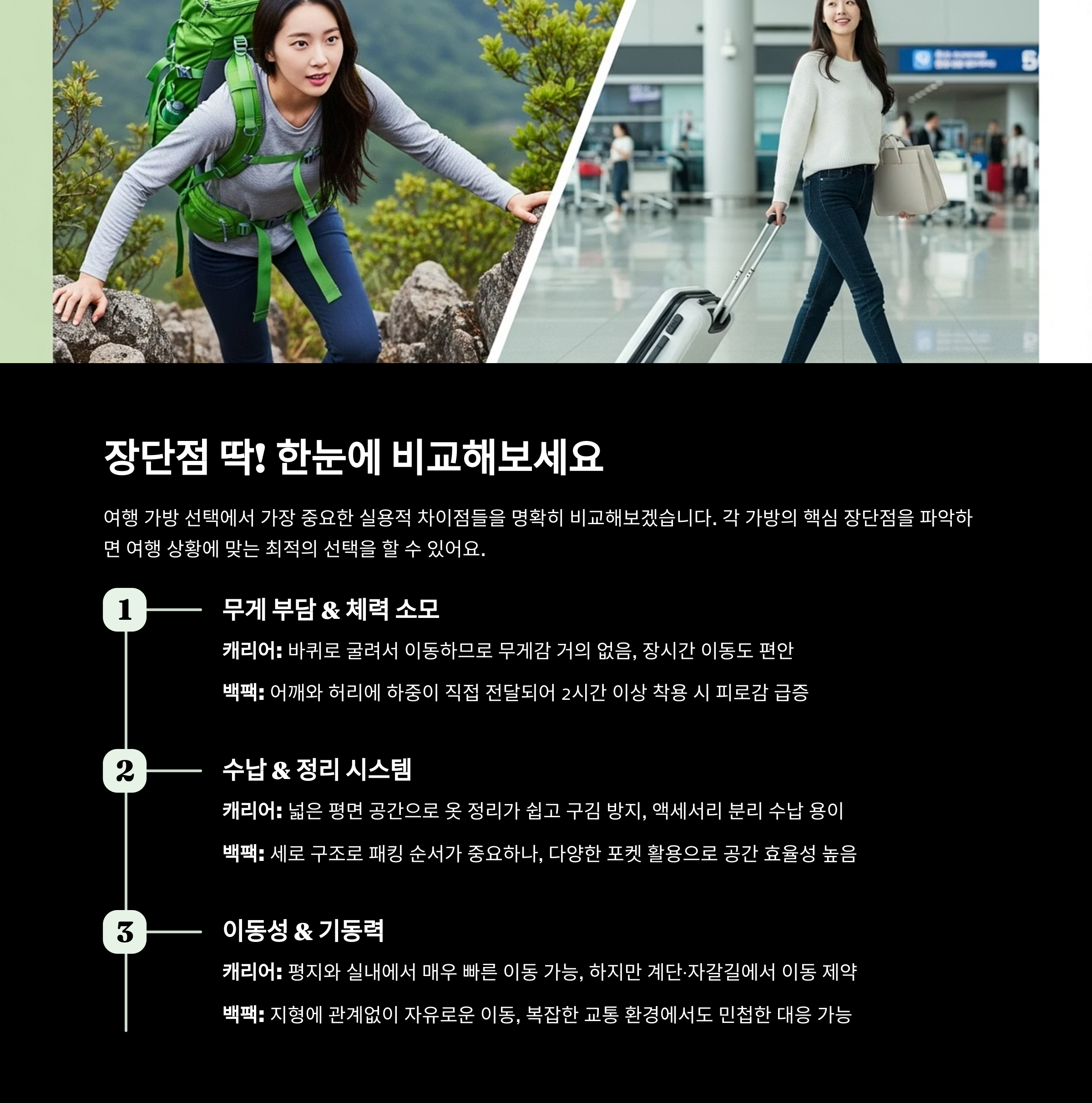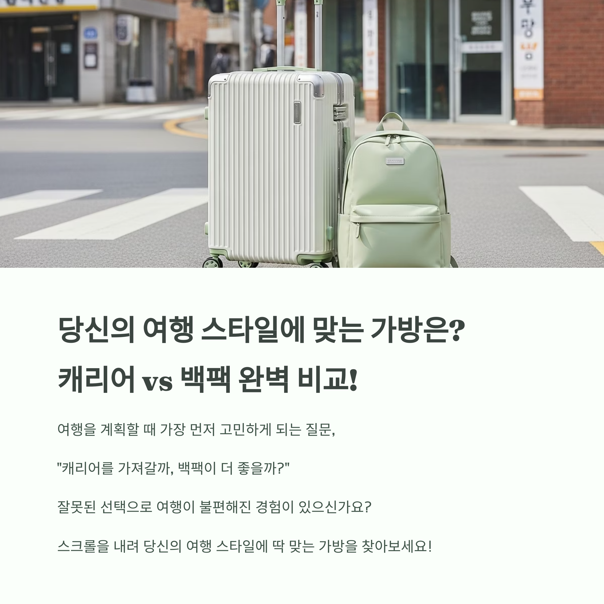 | 치안 고려 | 잠금장치 있는 캐리어가 보안에 유리 | 몸에 밀착된 백팩이 소매치기 방지에 유리 |