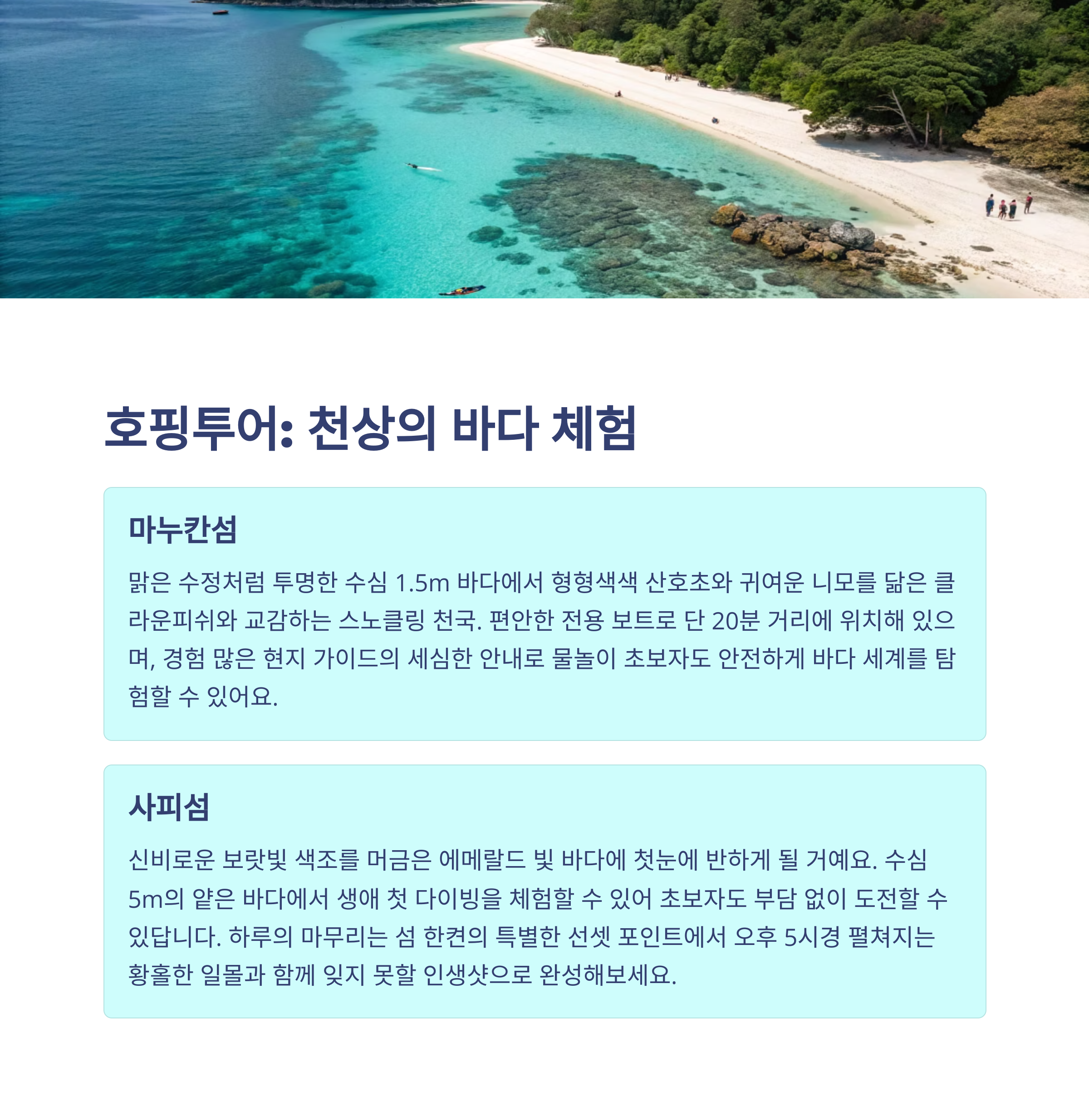 • 마누칸 or 사피섬 선택 후 해변 여유 + 스노클링