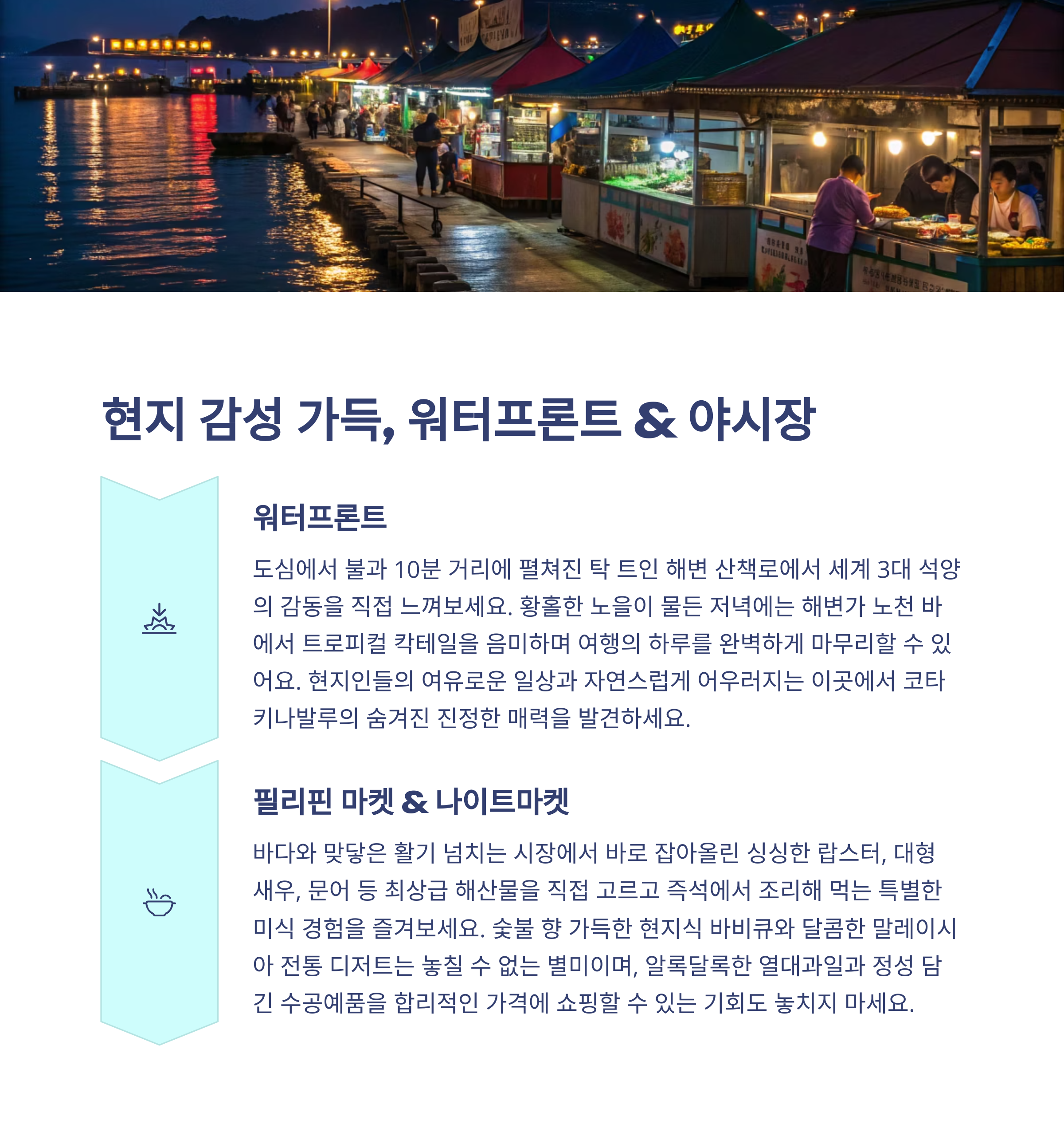 | 일정 구성 | 4박 5일 기준 / 호핑투어 중심 + 야시장 + 일몰 명소 포함 |