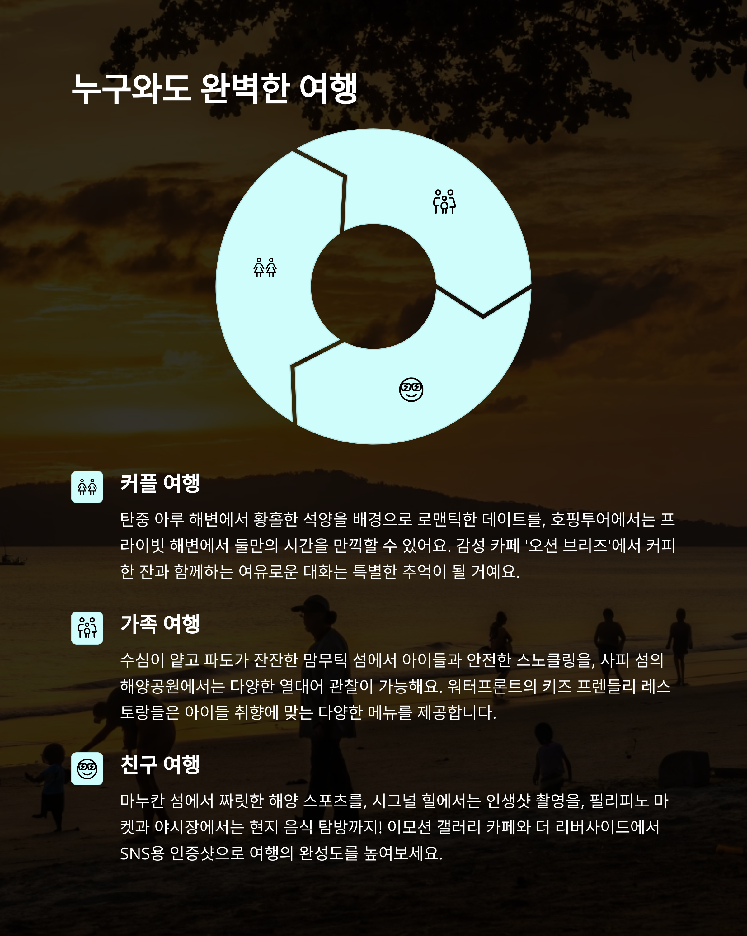 | 추천 대상 | 커플여행, 여자 둘 여행, 가족여행, 동남아 초보자 |