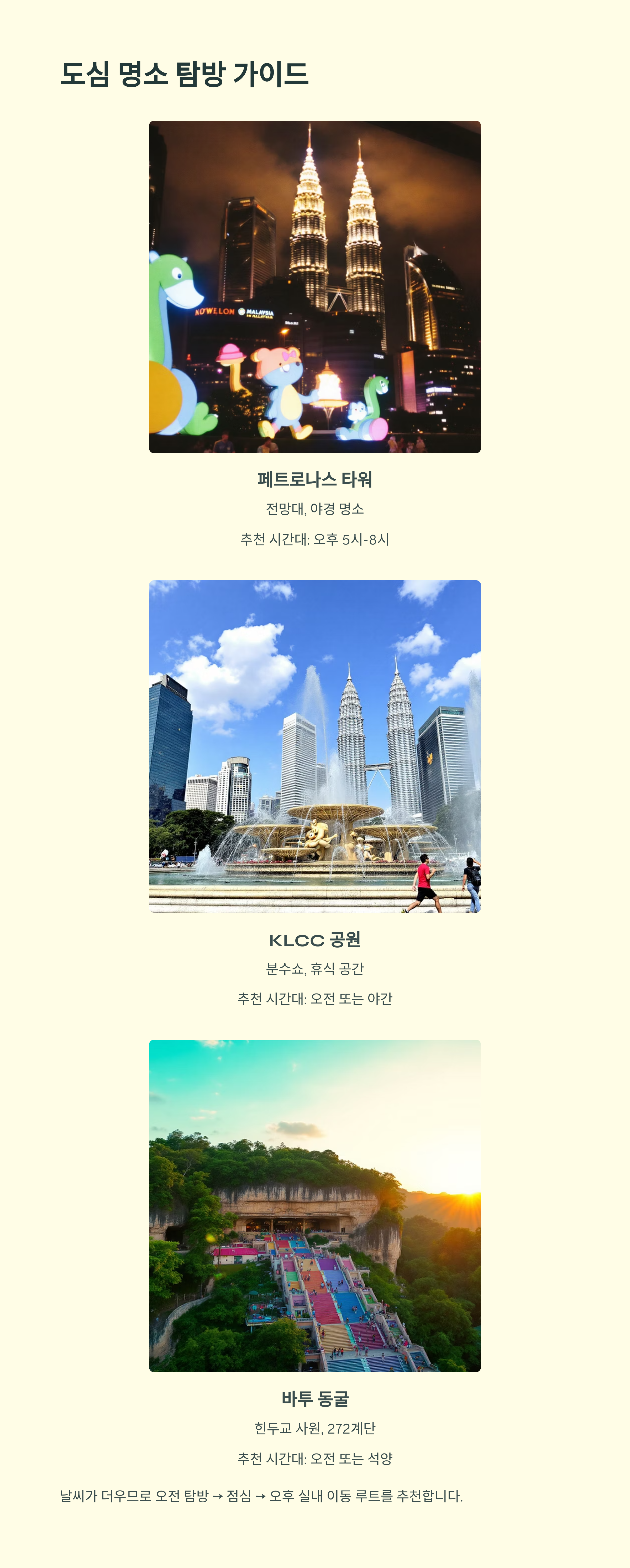 | KLCC 공원 | 분수쇼, 가족 단위 휴식 공간 | 오전 or 야간 |
