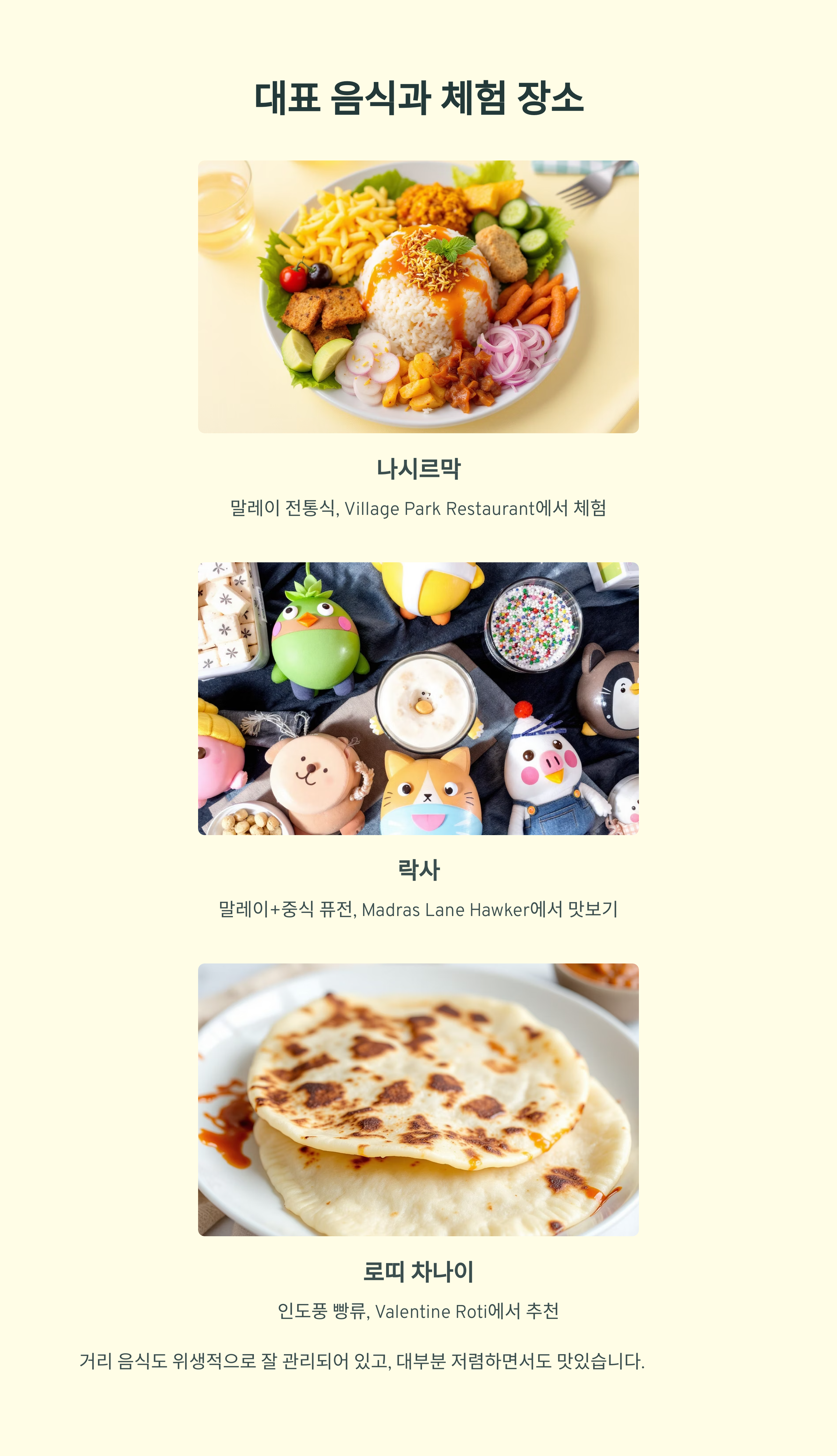 "거리 음식도 위생적으로 잘 관리되어 있고, 대부분 저렴하면서도 맛있습니다."