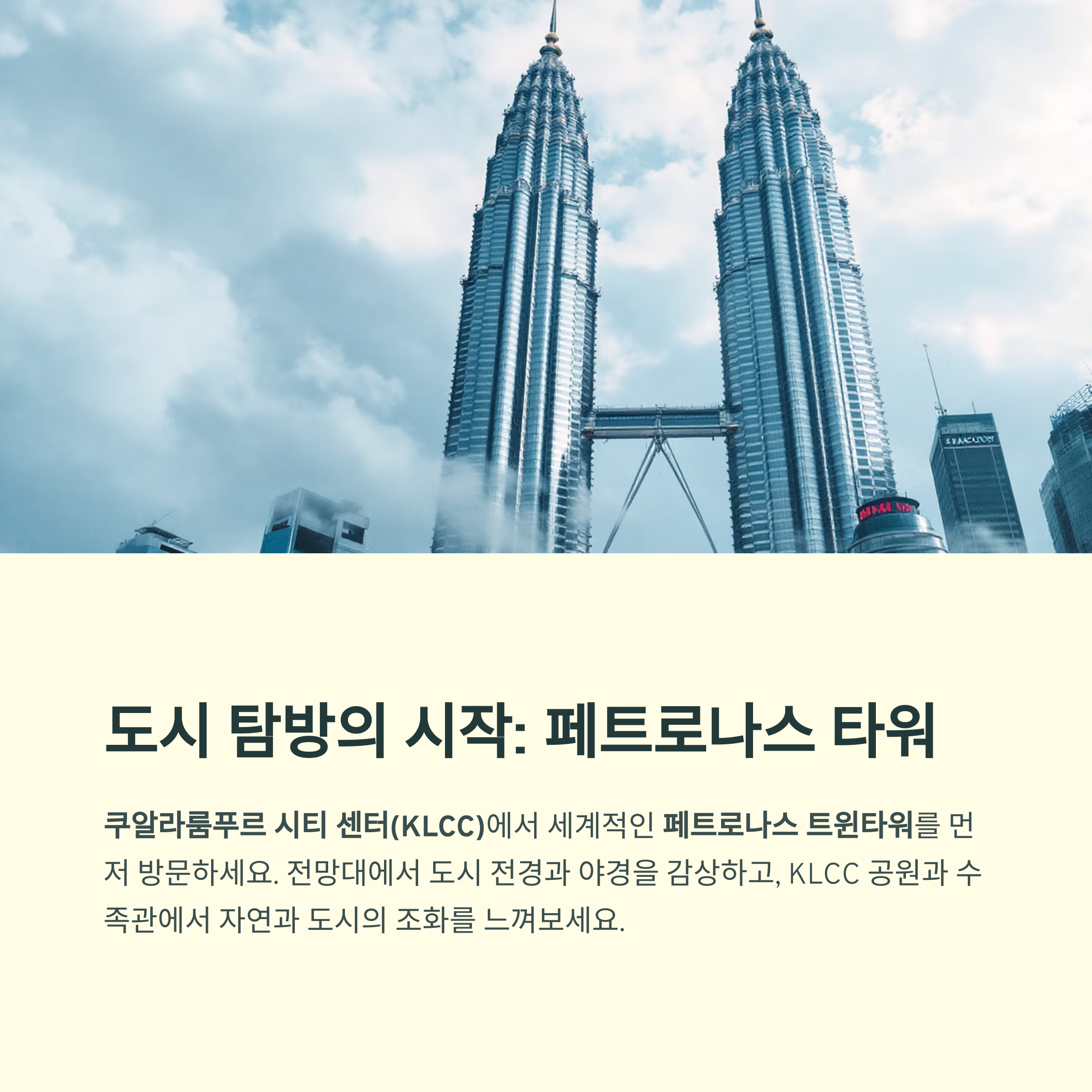 **페트로나스 트윈타워(Petronas Twin Towers)**를 보는 것으로 시작하는 것이 정석입니다.