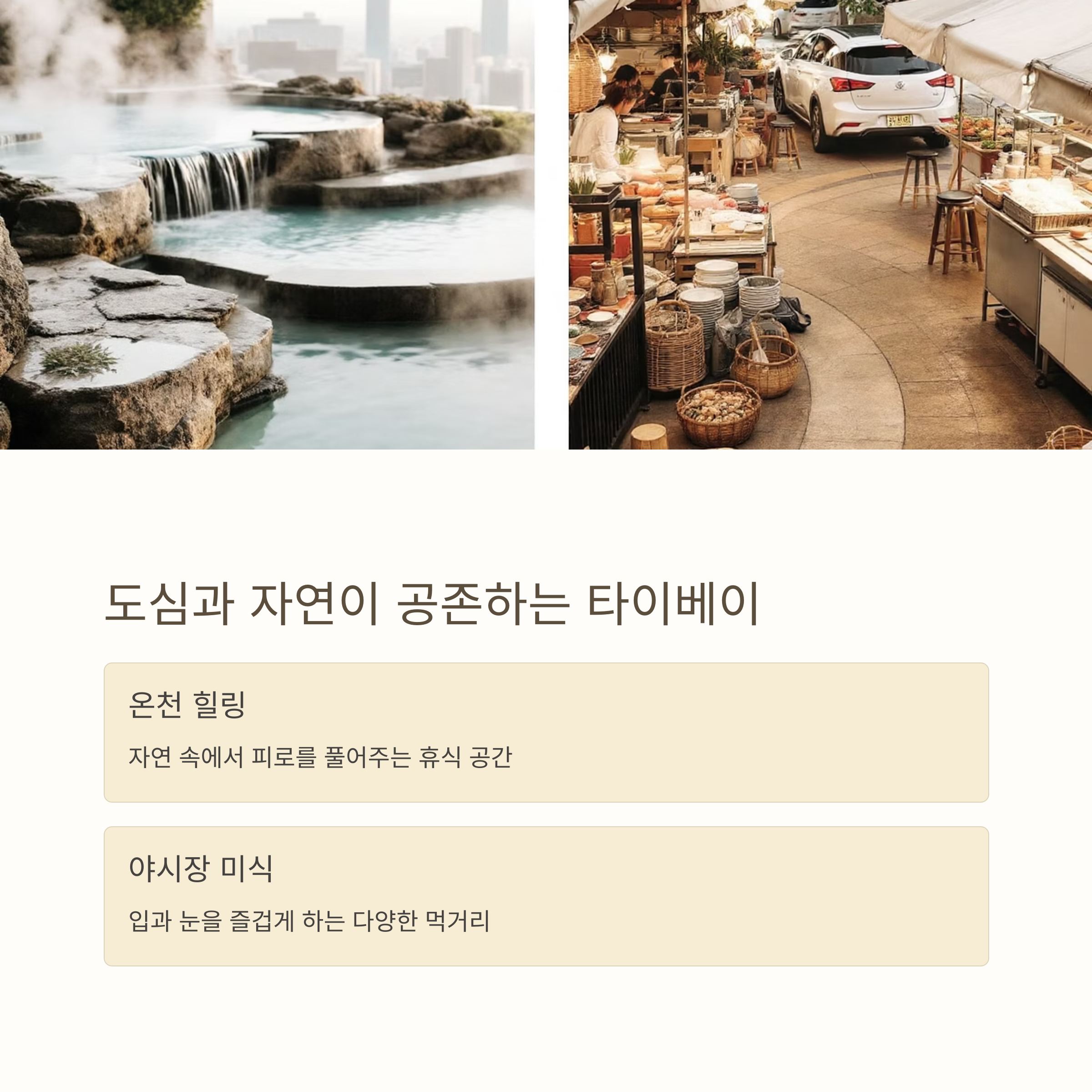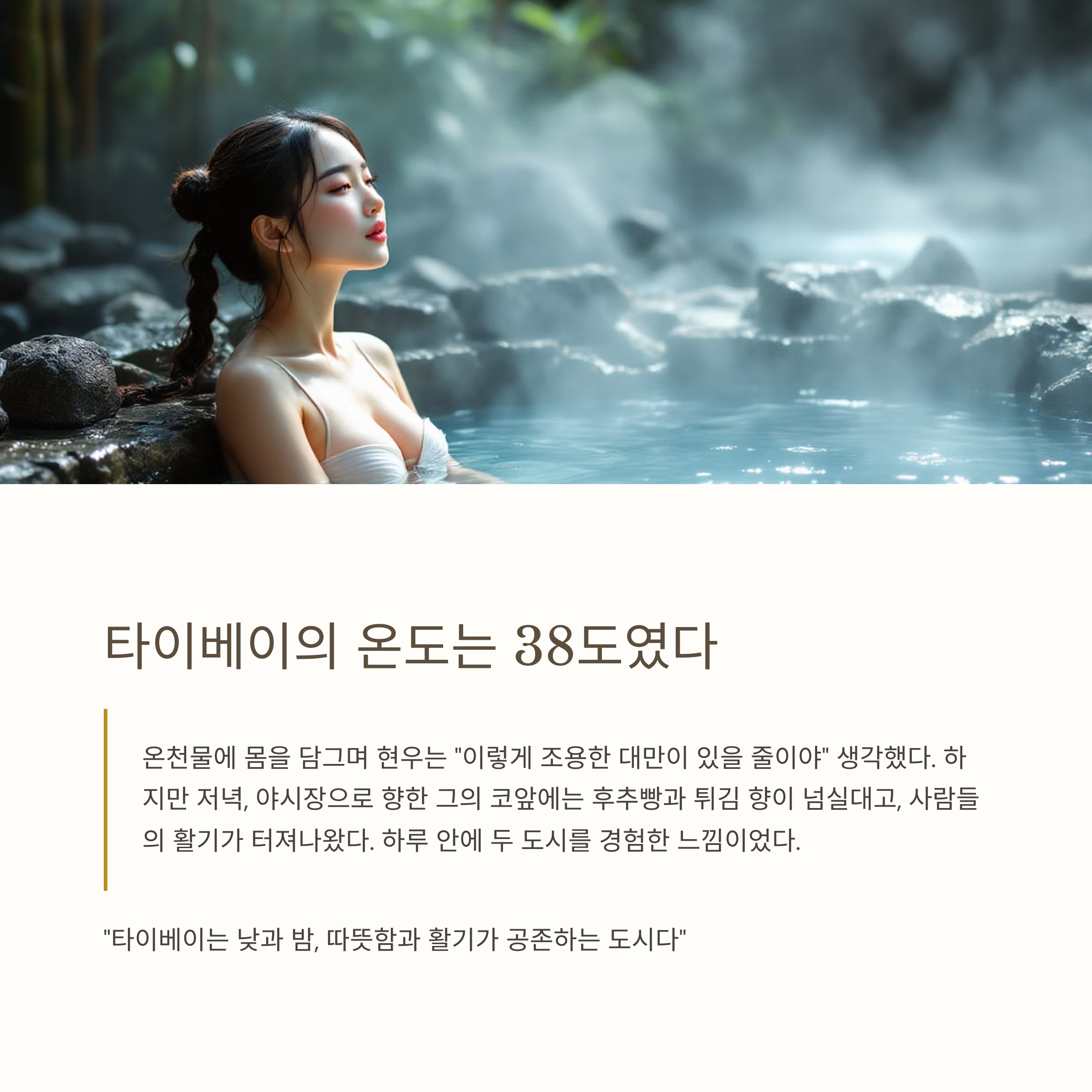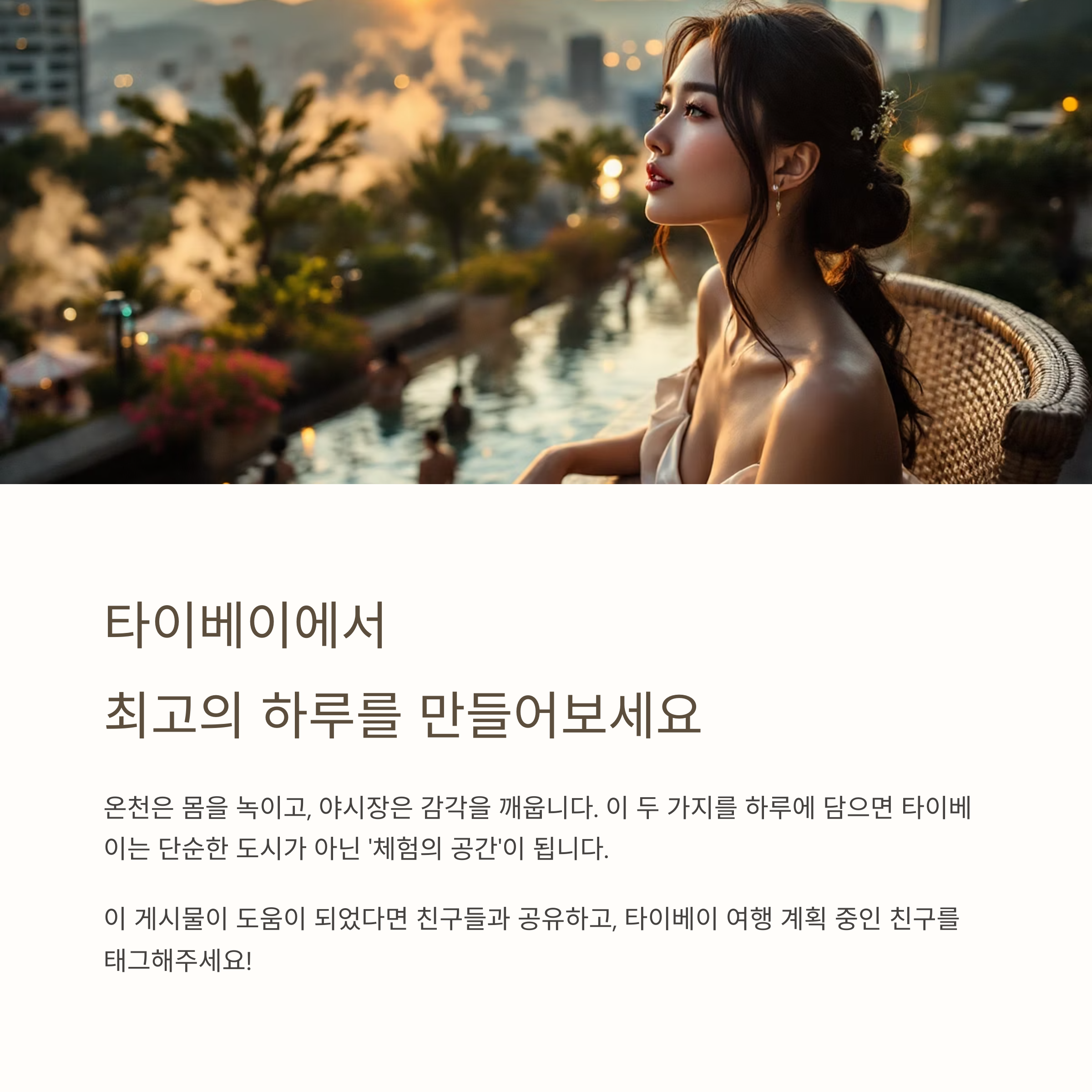 밤의 야시장 탐방과 낮의 온천 휴식은 타이베이를 가장 타이베이다운 방식으로 느끼는 여정입니다.