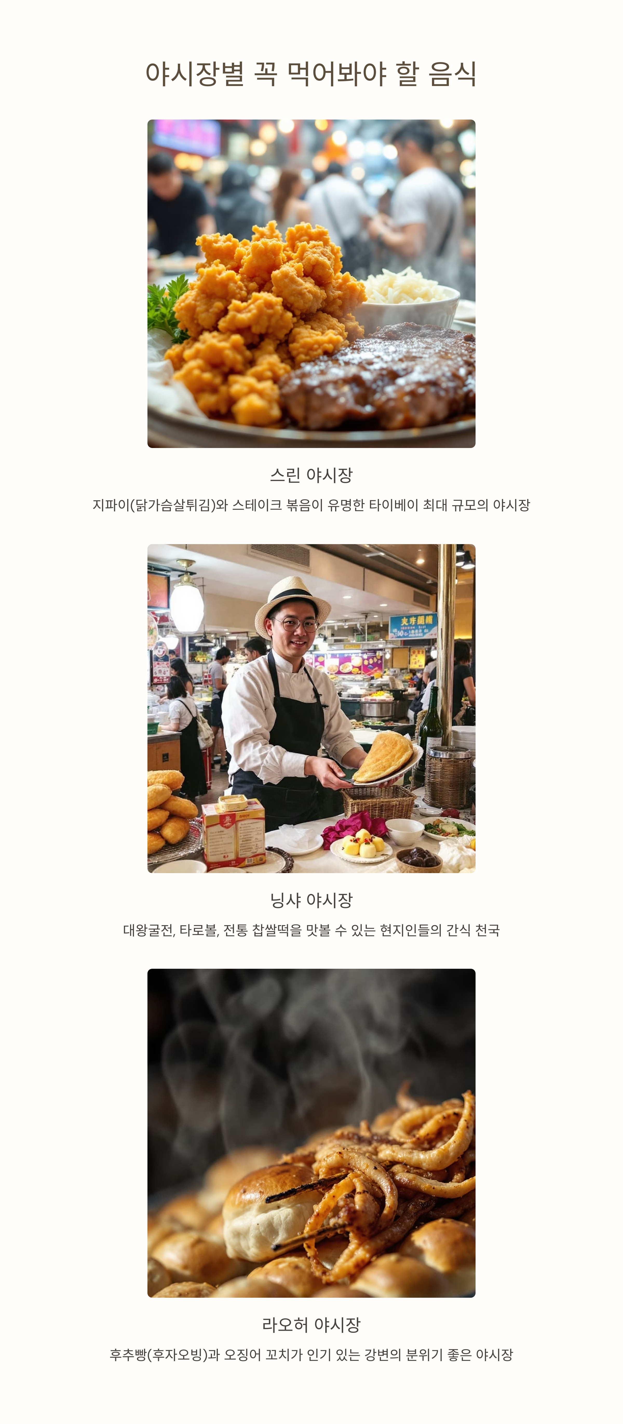 | 스린 야시장 | 규모 최대, 쇼핑과 음식 다양 | 지파이(닭가슴살튀김), 스테이크 볶음 |