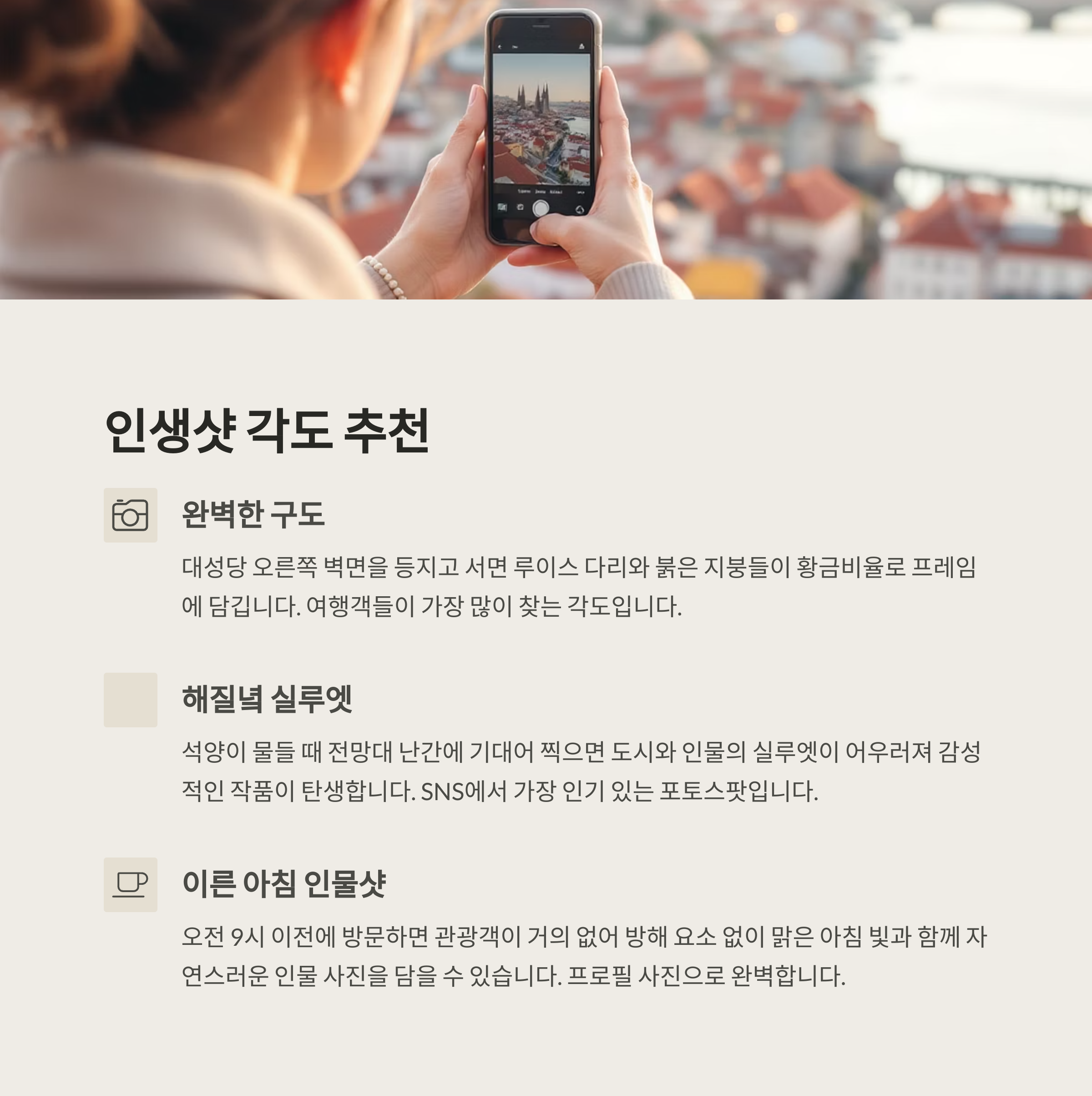 루이스 다리 + 붉은 지붕 도시 전경이 완벽하게 담깁니다. - 해질녘에는 사람 그림자까지 실루엣처럼 담기며