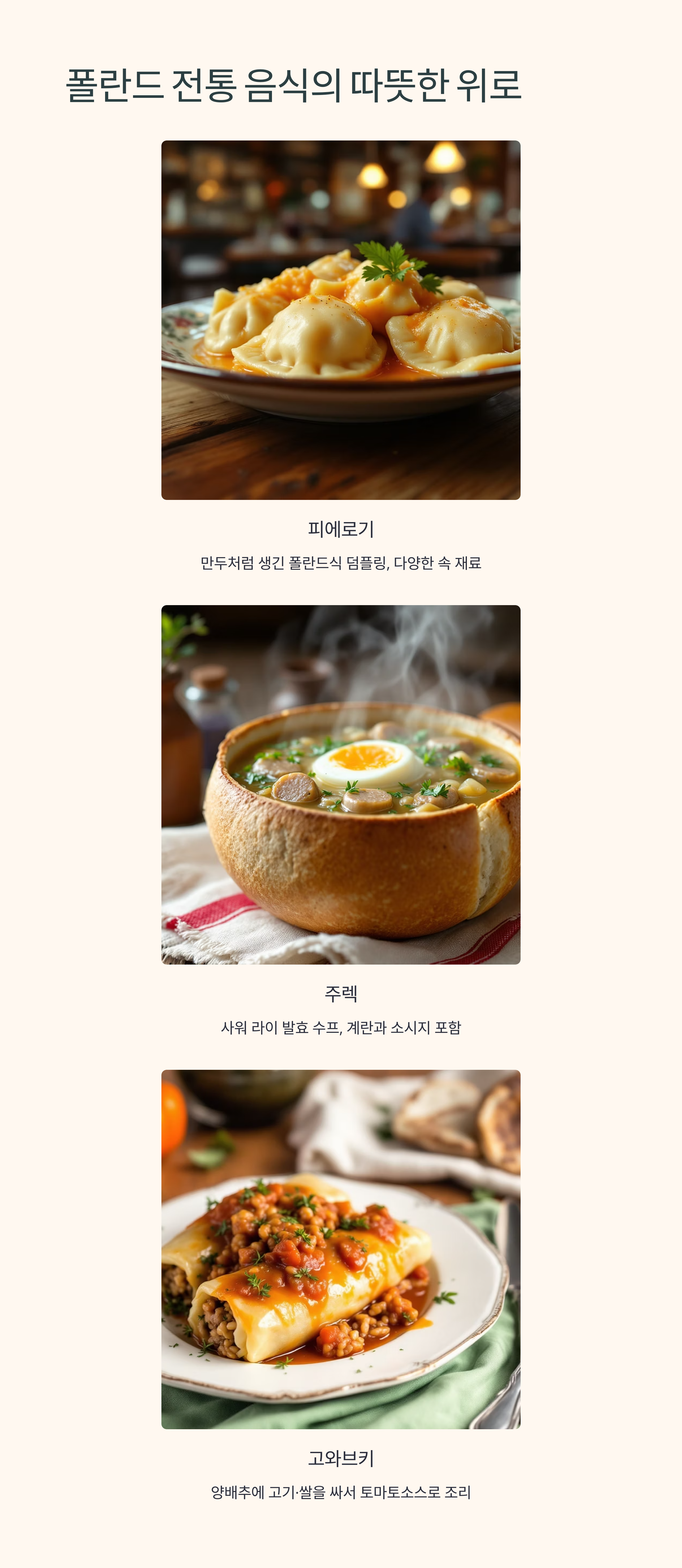 | 피에로기 (Pierogi) | 만두처럼 생긴 폴란드식 덤플링, 고기·감자·치즈 속 다양 |