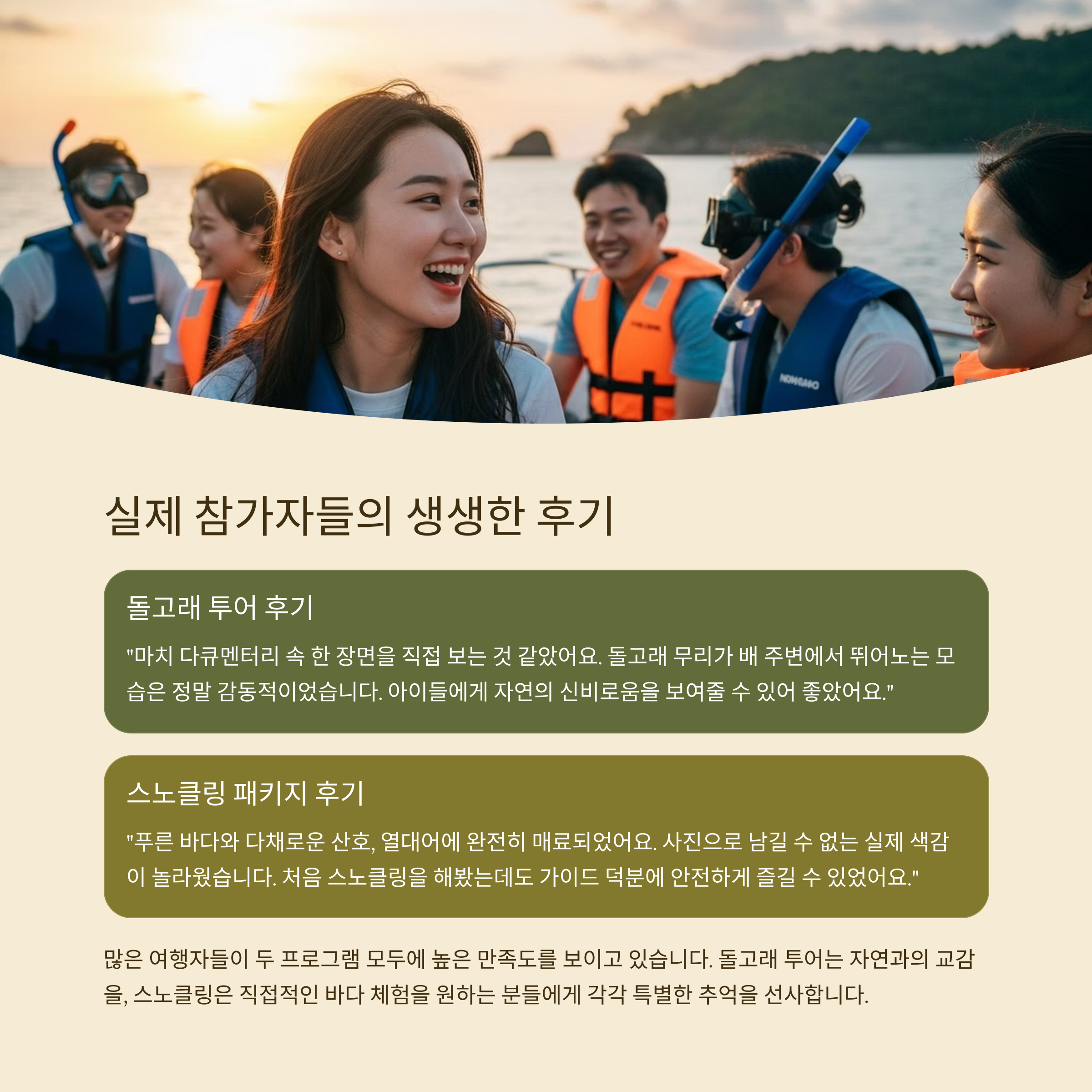 돌고래 투어는 자연 친화적 경험을, 스노클링은 액티비티와