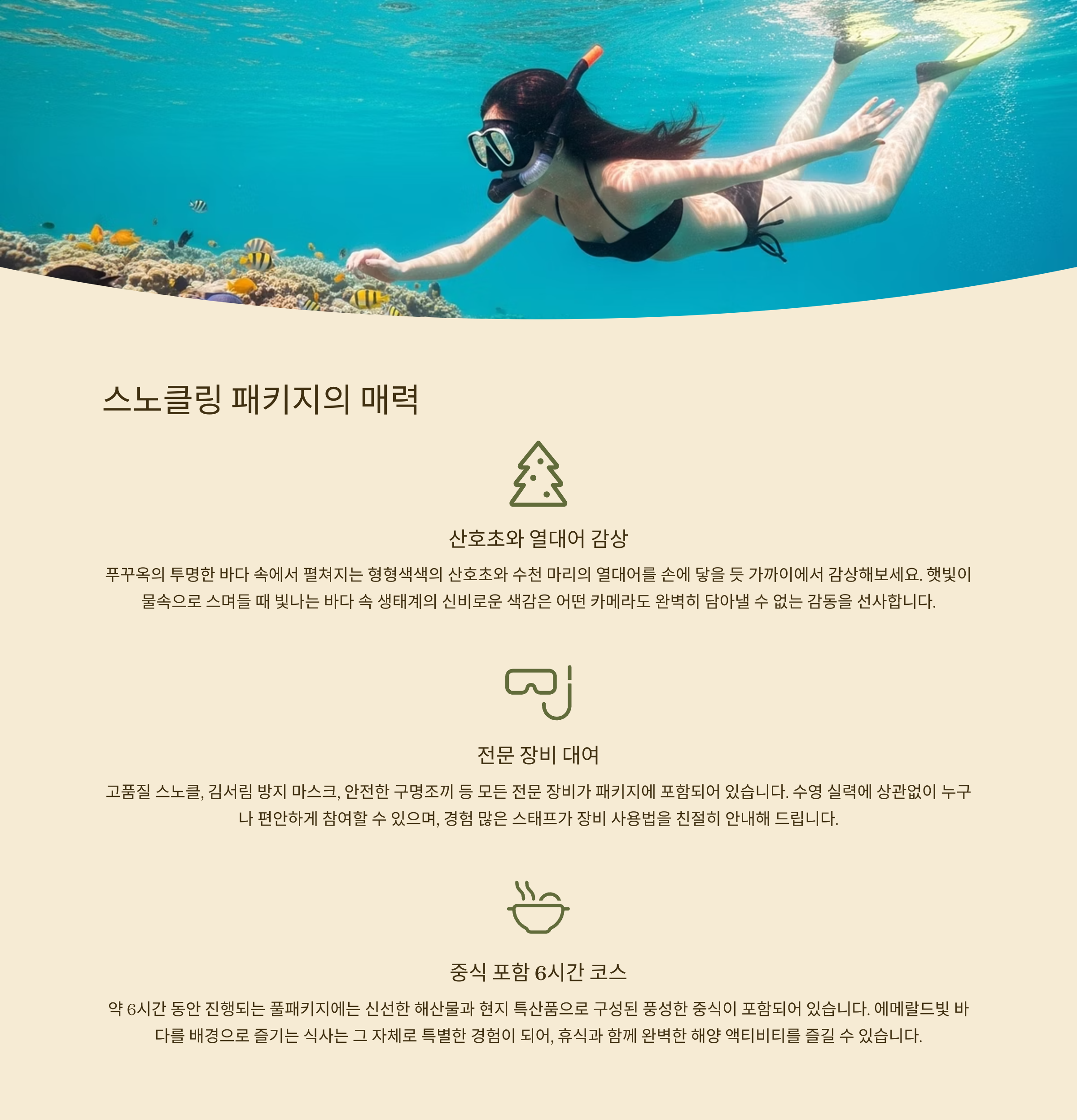 스노클링 패키지는 맑고 따뜻한 바다에서 산호초와 형형색색의
