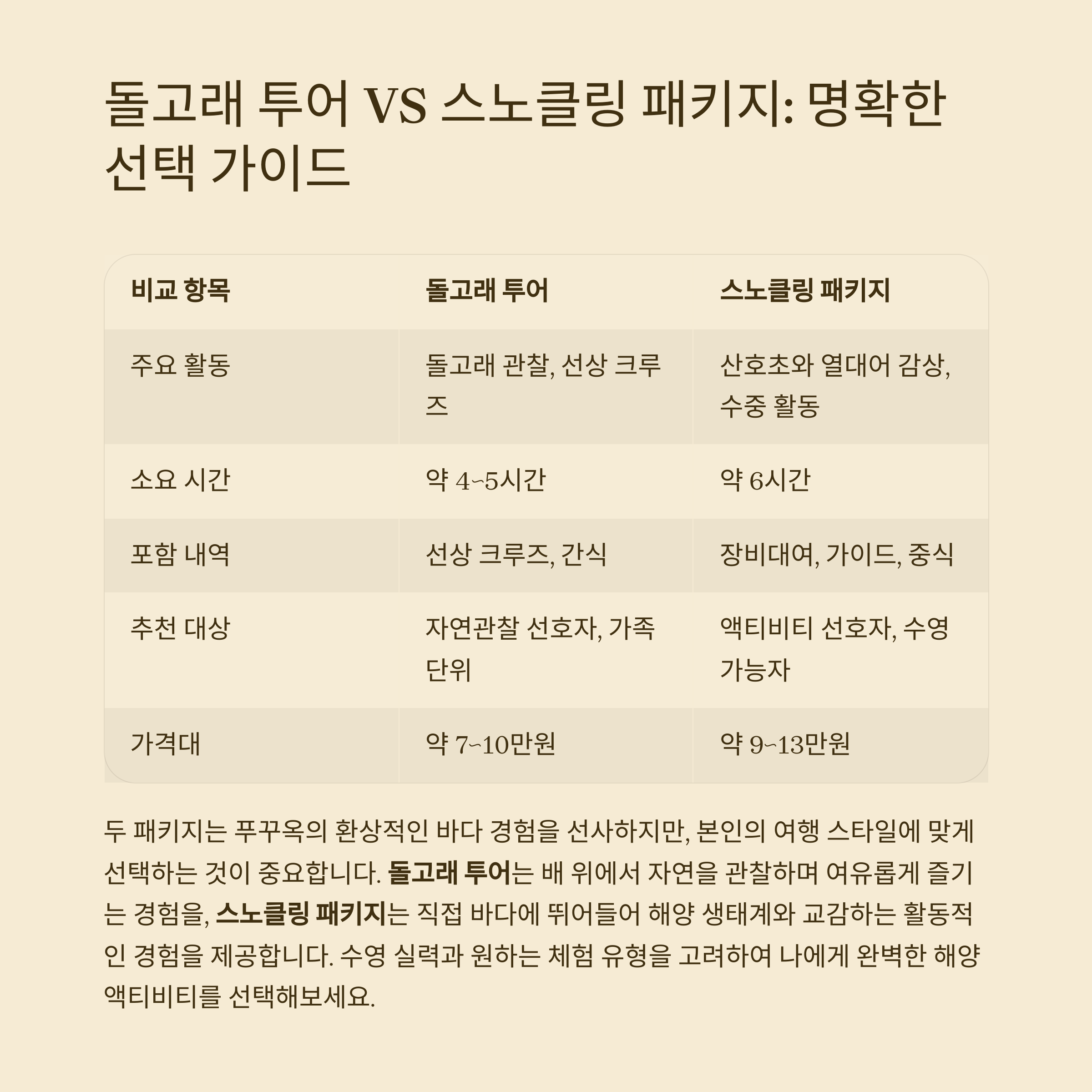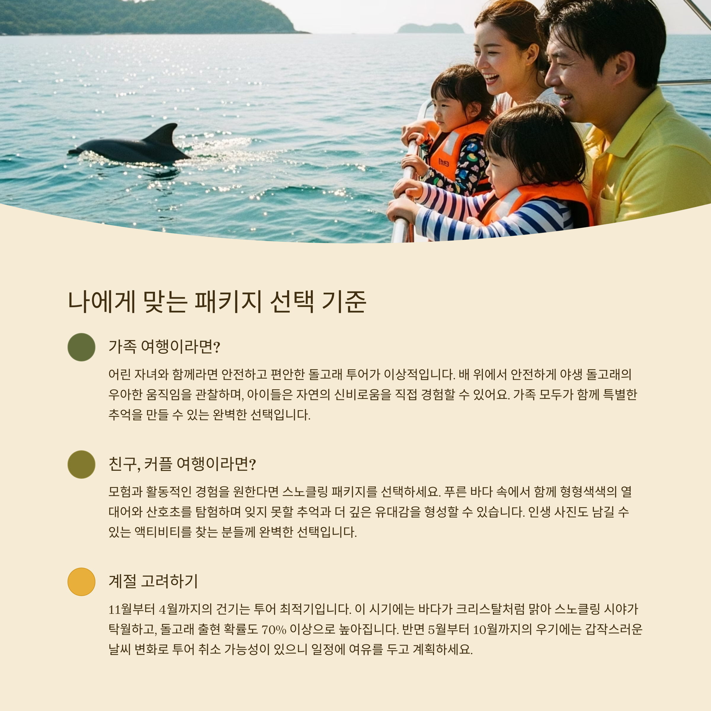 돌고래 투어 vs 스노클링, 패키지 구성 비교표