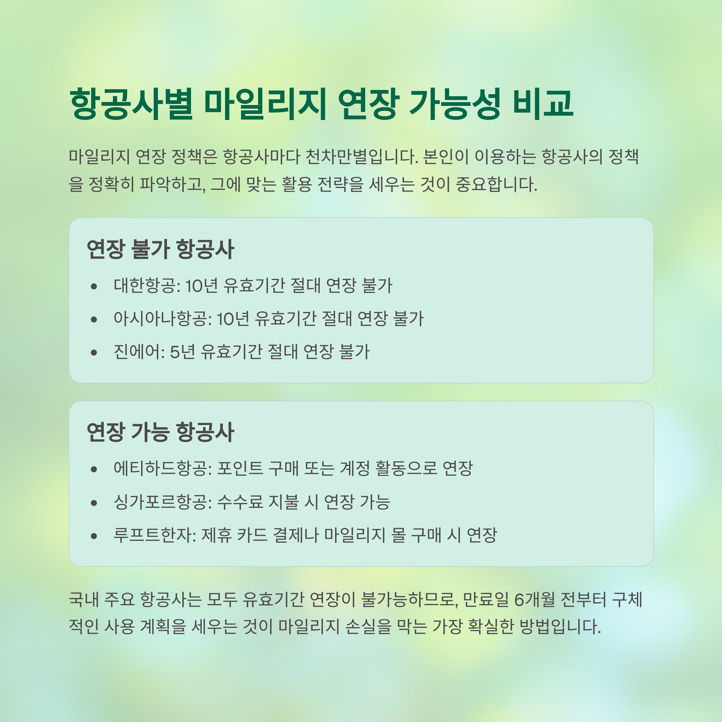 ※ 국내 항공사 대부분은 유효기간이 연장되지 않습니다. 따라서 만료일 전 사용이 가장 현실적인 전략입니다.