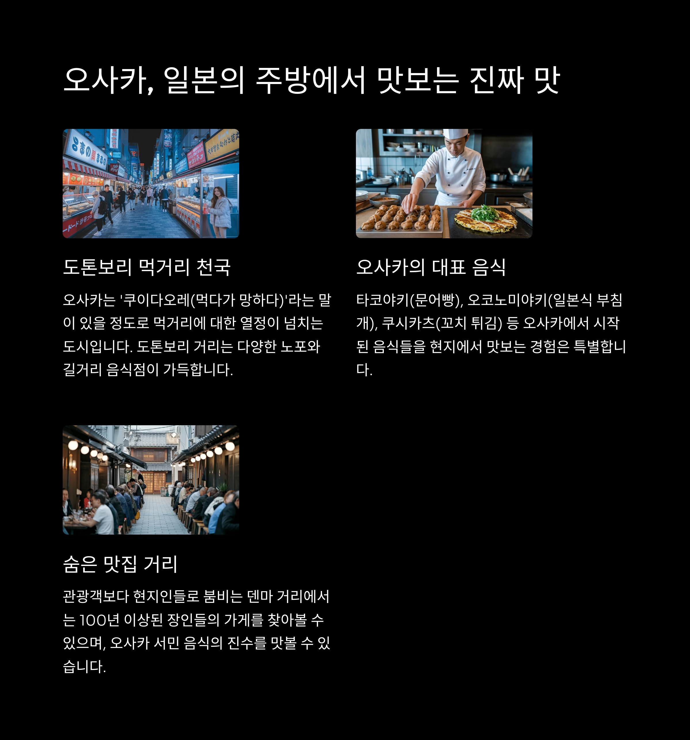 "오사카는 '먹다가 망하는 도시'라는 별명이 있을 정도로 먹거리 천국입니다."