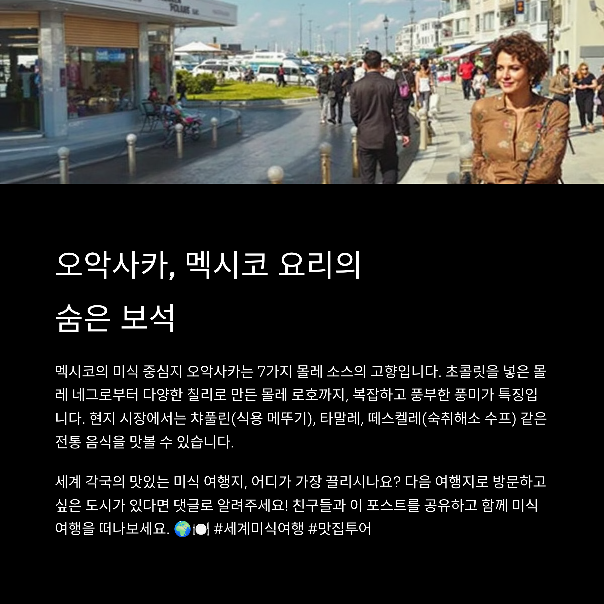 "오악사카는 멕시코 요리의 정수를 느낄 수 있는 미식 여행지입니다."