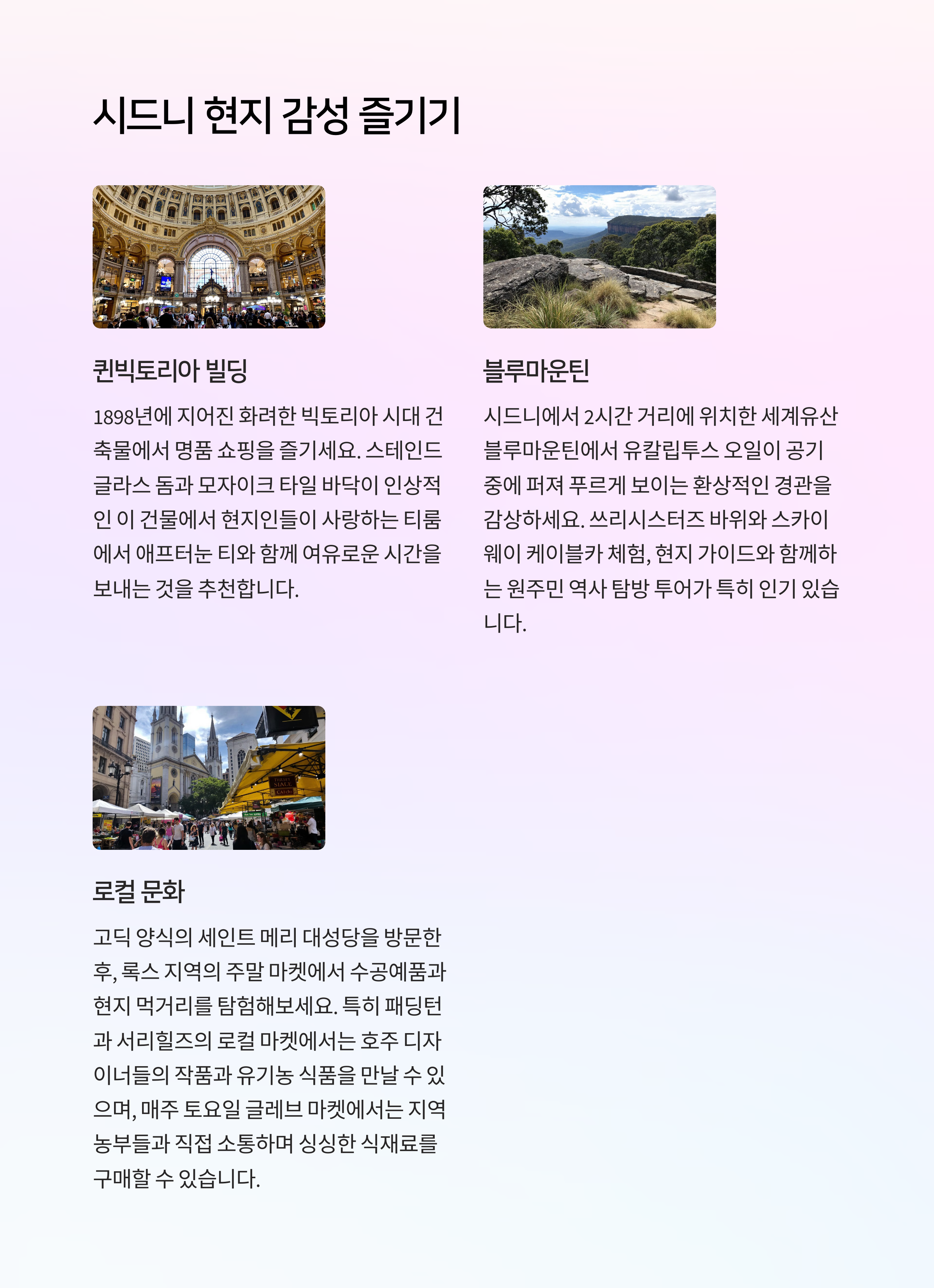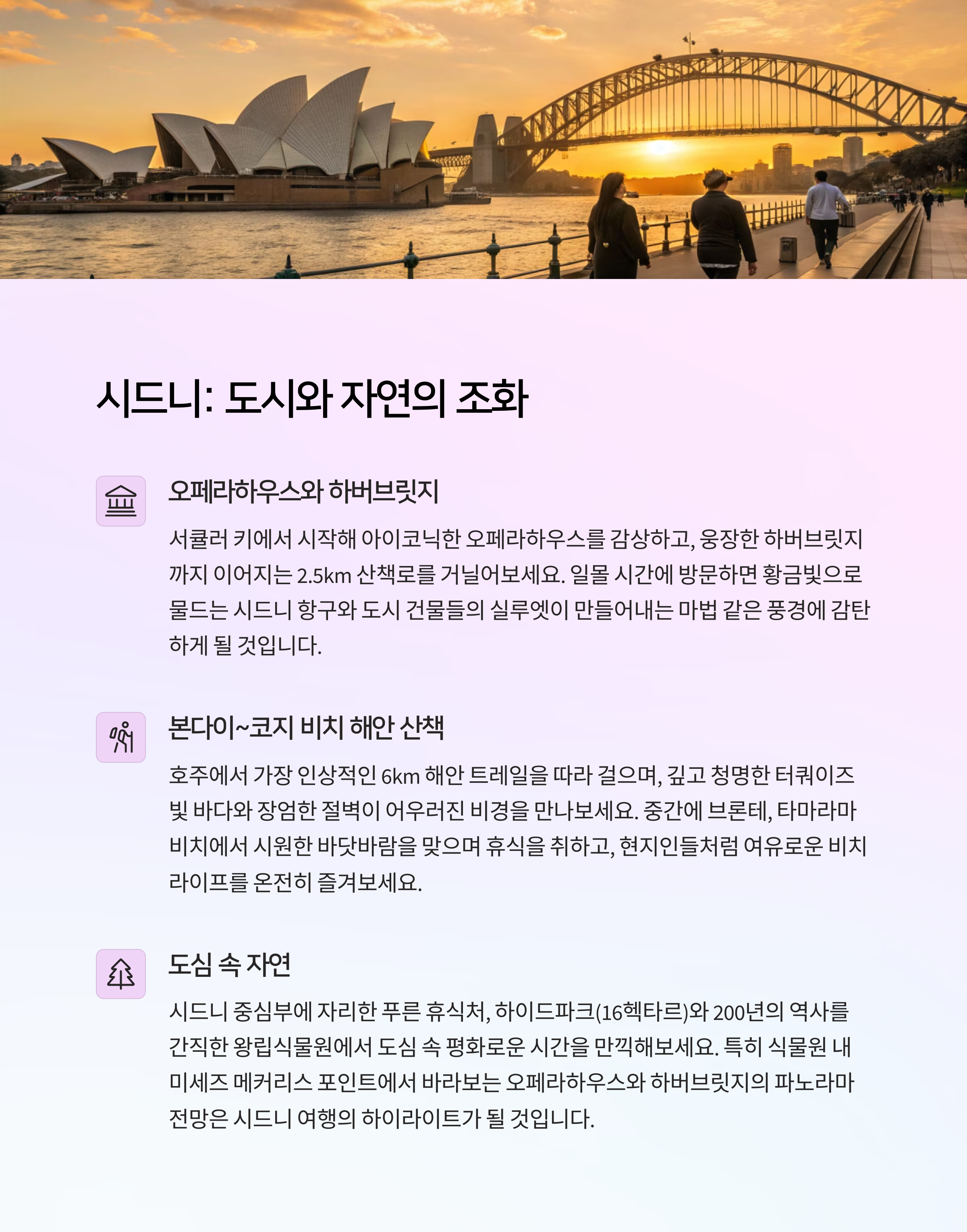 | 시드니 | 3박 | 도심 감성 + 해안 산책 |