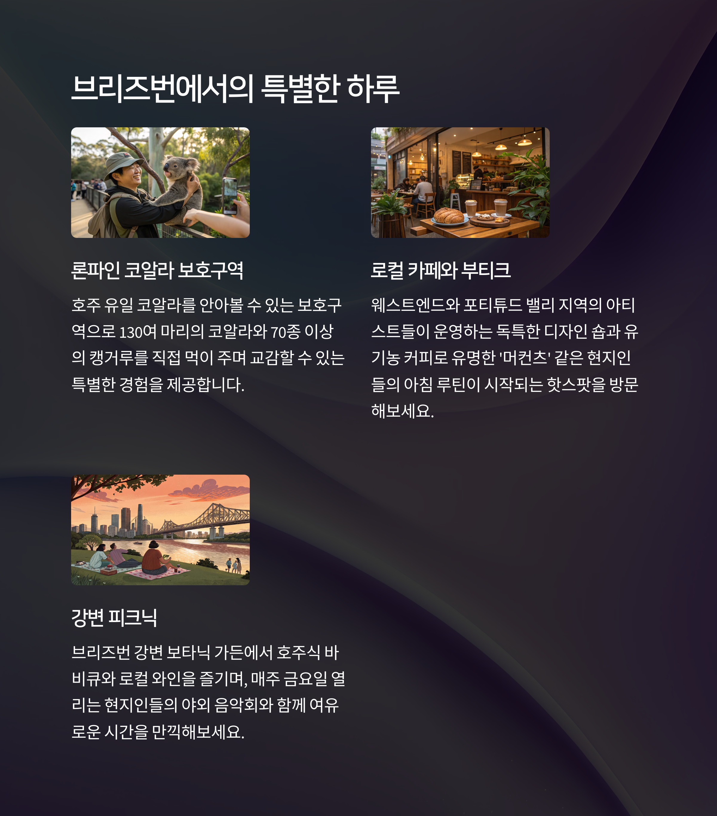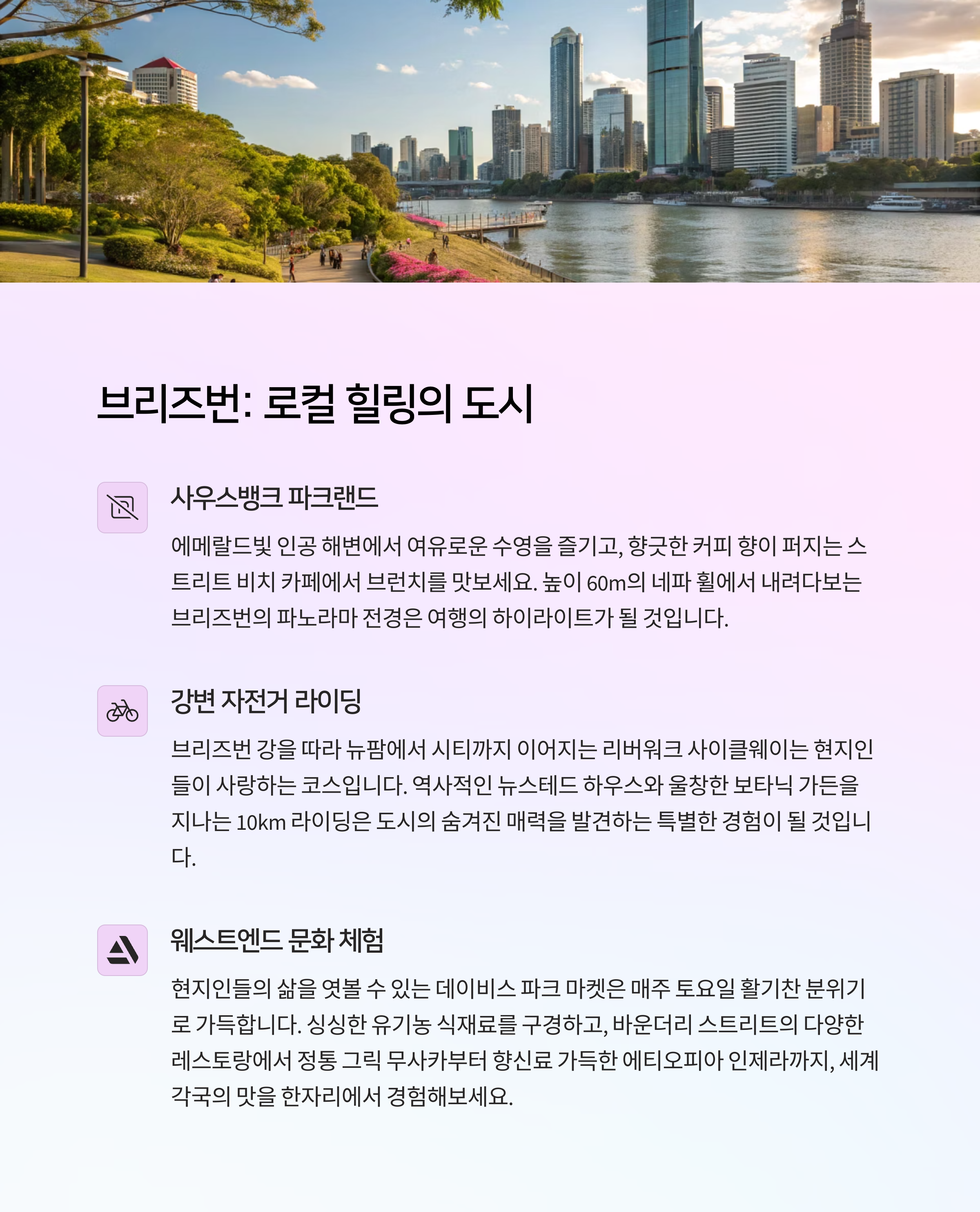 | 브리즈번 | 1~2박 | 로컬 감성 + 자연 힐링 |