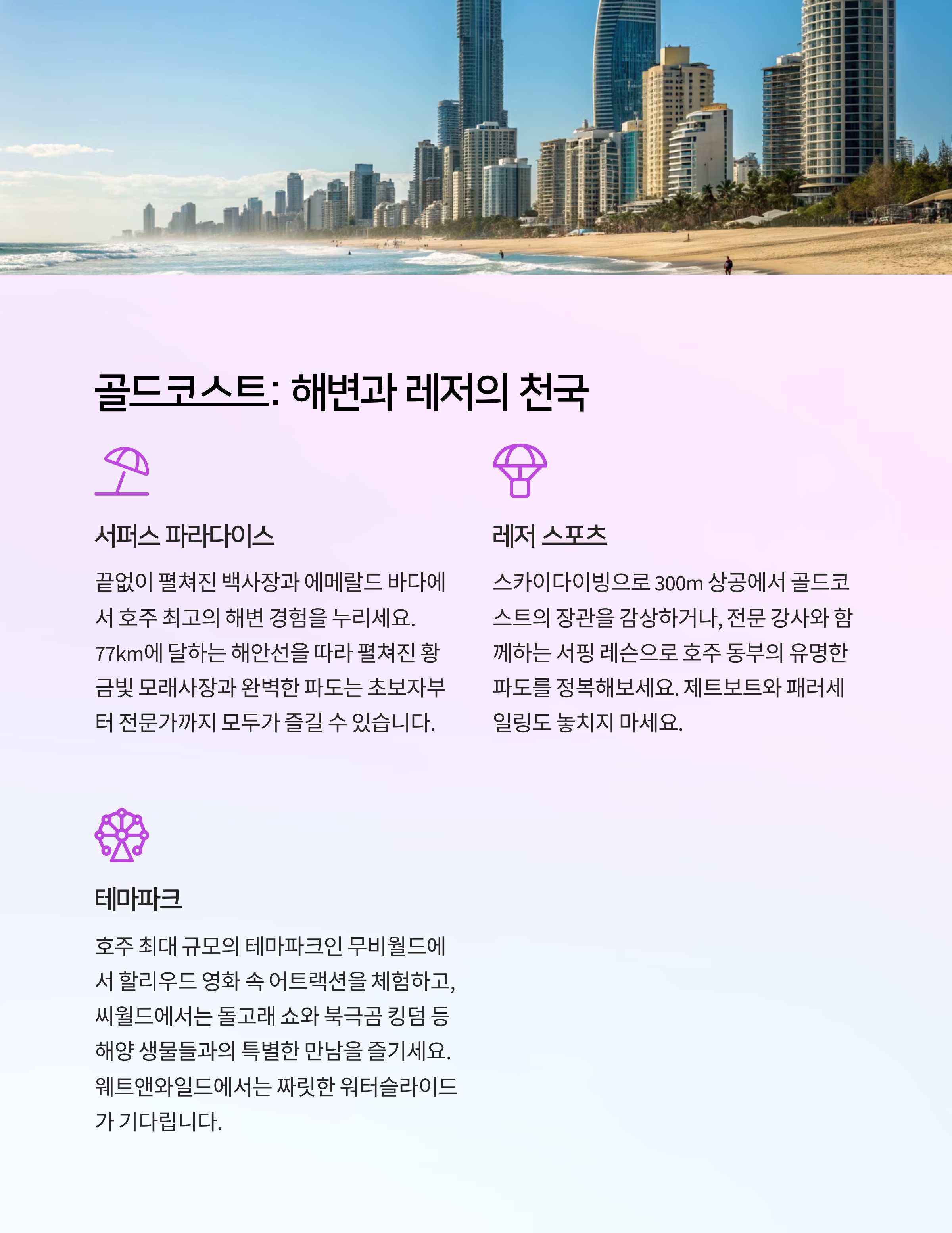 | 골드코스트 | 3박 | 해변+서핑+레저 |