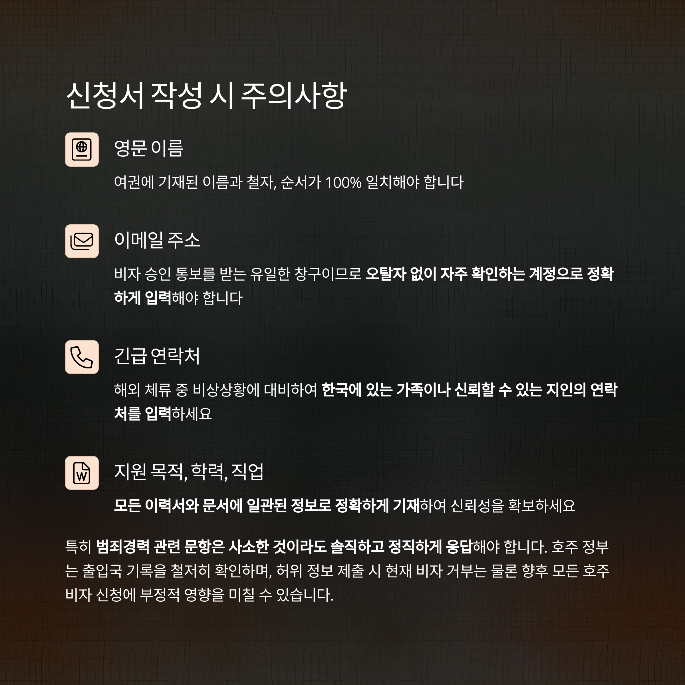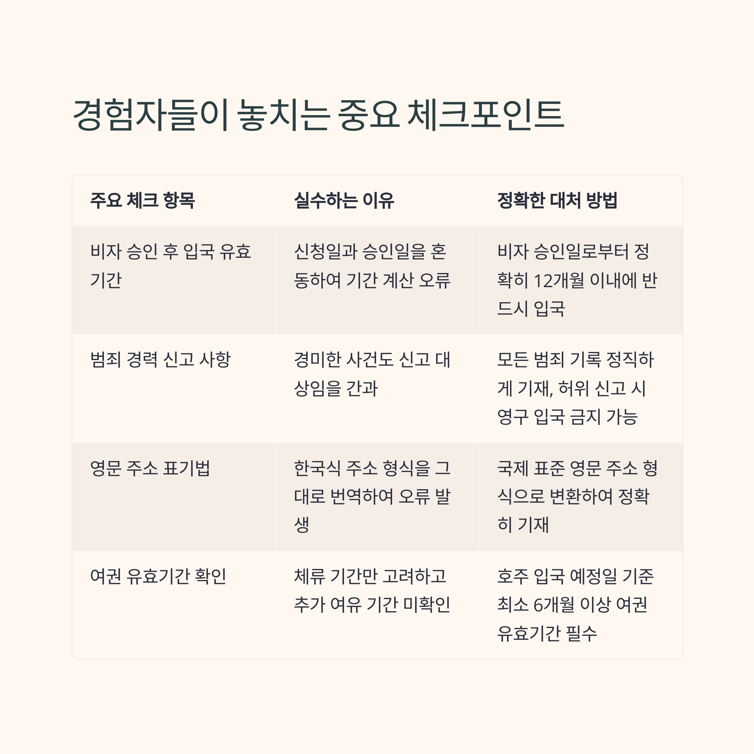 | 범죄 경력 확인 문항 | 경미한 사건 무시 | 거짓 기재 시 비자 취소 위험 |