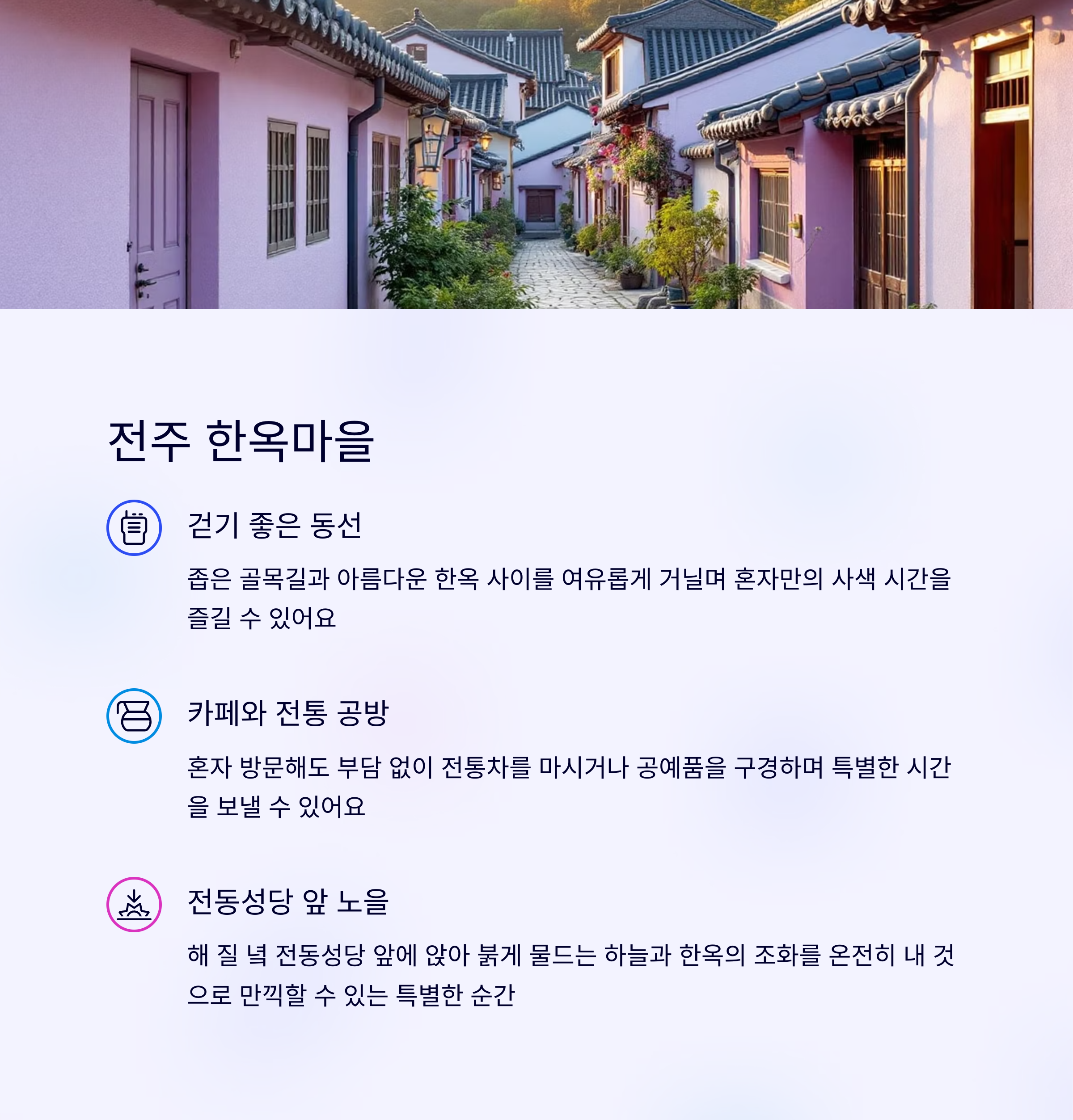 혼자 여행을 고민하는 분들에게 가장 중요한 건 ‘안전함’과 ‘감성’입니다.