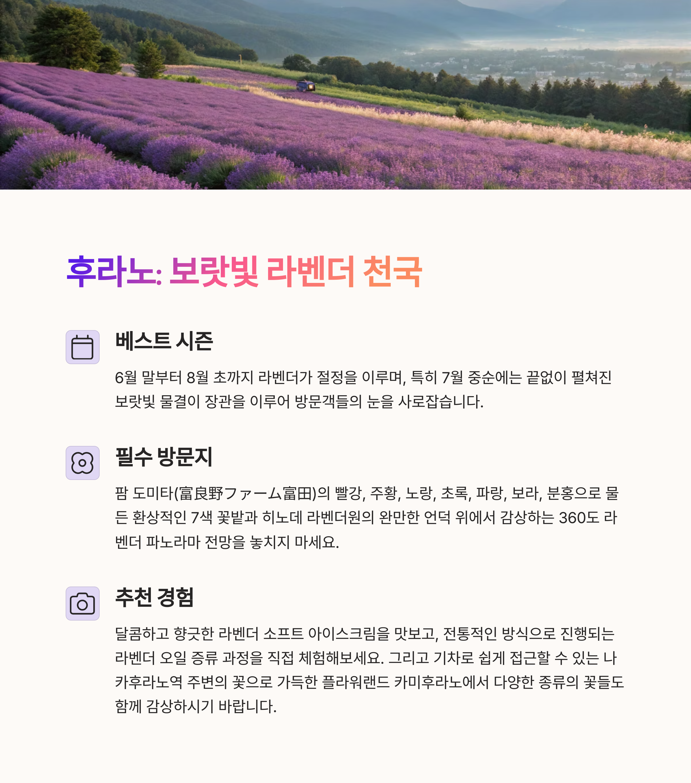 | 추천 시즌 | 6월 말 ~ 8월 초 (후라노 라벤더 절정) |