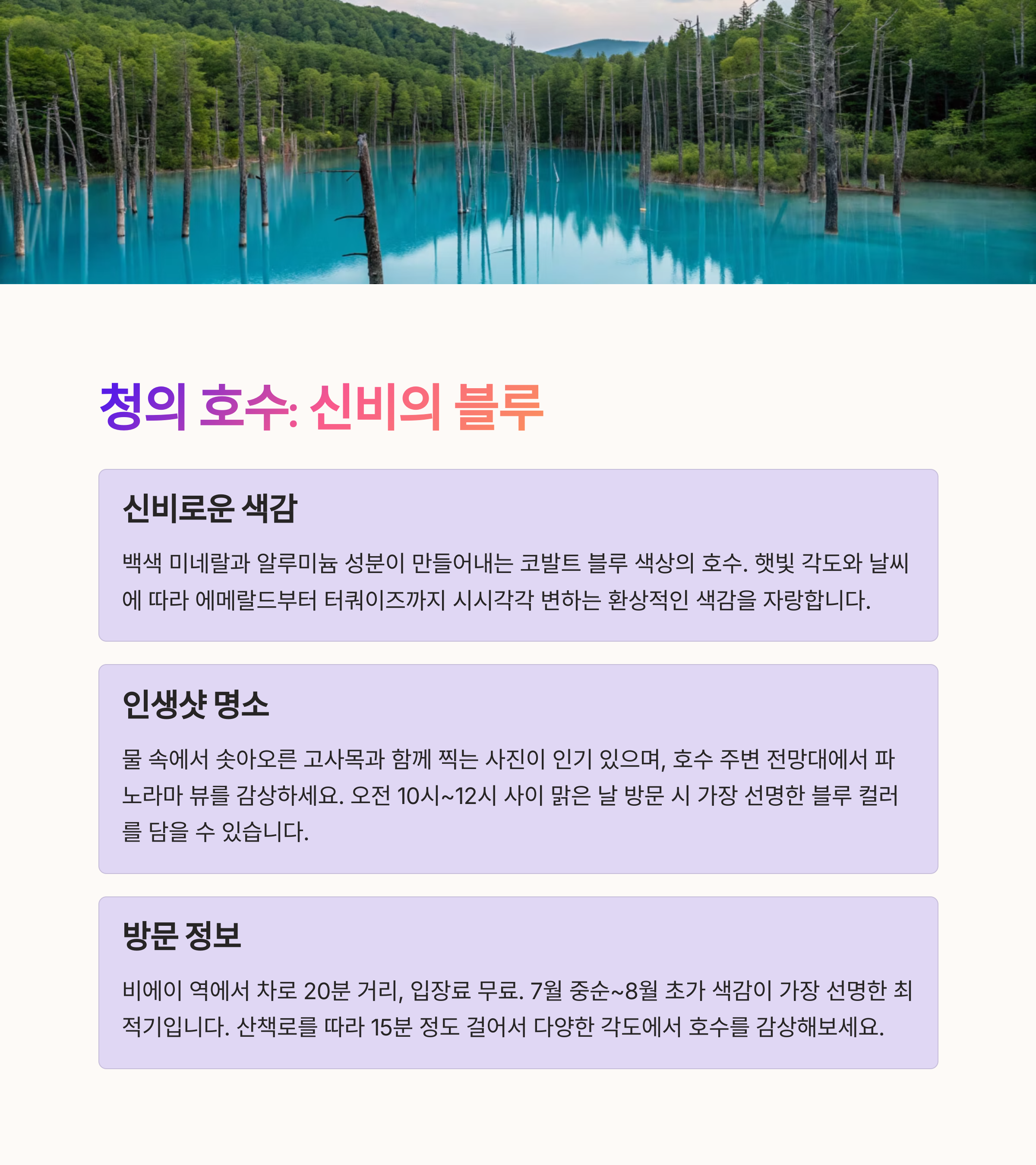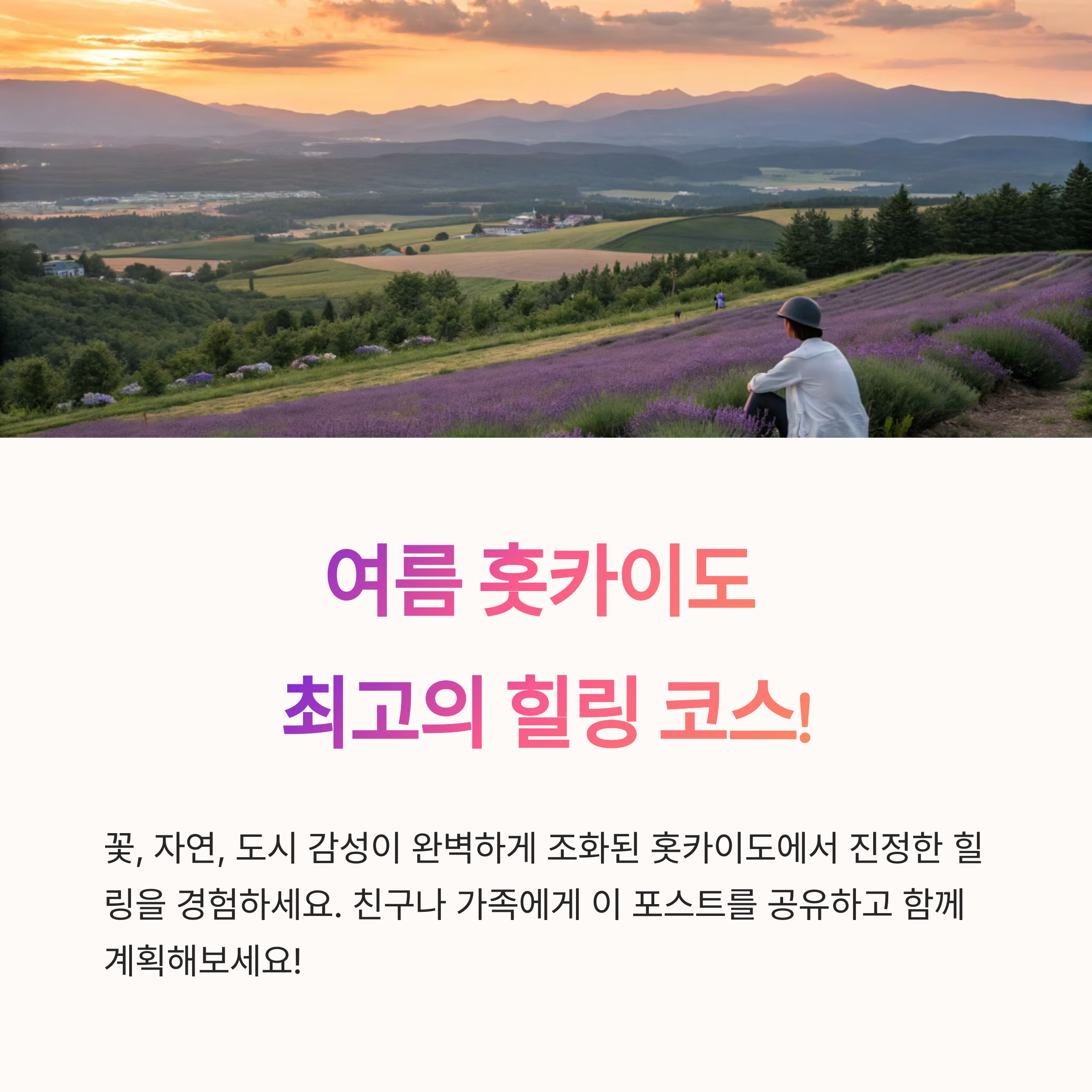 홋카이도는 도심과 자연, 여유와 감성이 가장 균형 있게 공존하는 여름 여행지입니다. 후라노의 라벤더 향기, 비에이의 끝없는 언덕, 그리고 삿포로의 맥주 한 잔까지. 이 루트를 따라가면 몸과 마음이 동시에 쉬어가는 진짜 힐링 중심 여행이 완성될 거예요. 올여름엔 무더위 피해 홋카이도로 떠나보는 건 어떠세요?