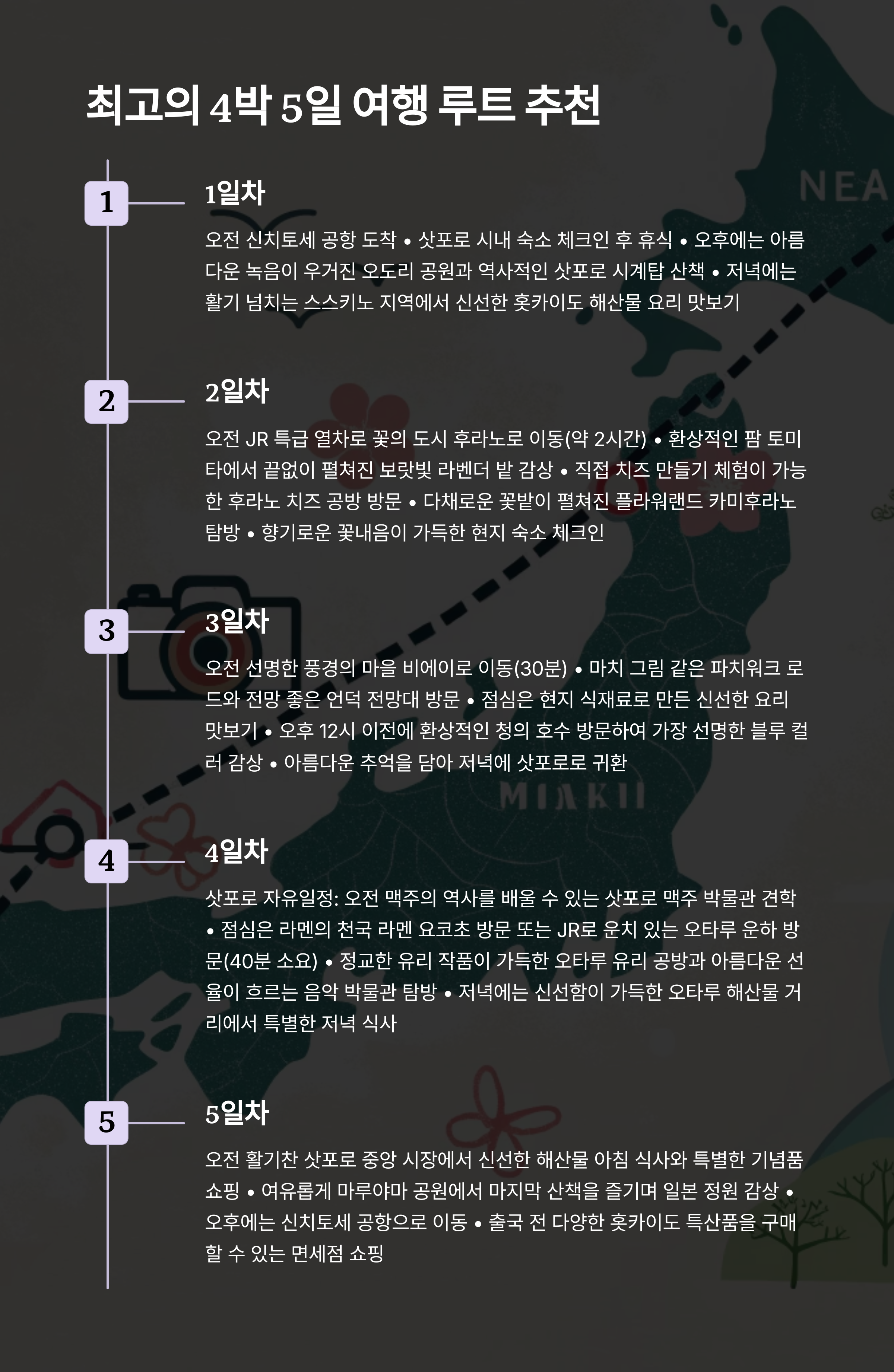 | 일정 구성 | 삿포로(2박) → 후라노(1박) → 비에이 당일치기 포함 → 삿포로(1박) |