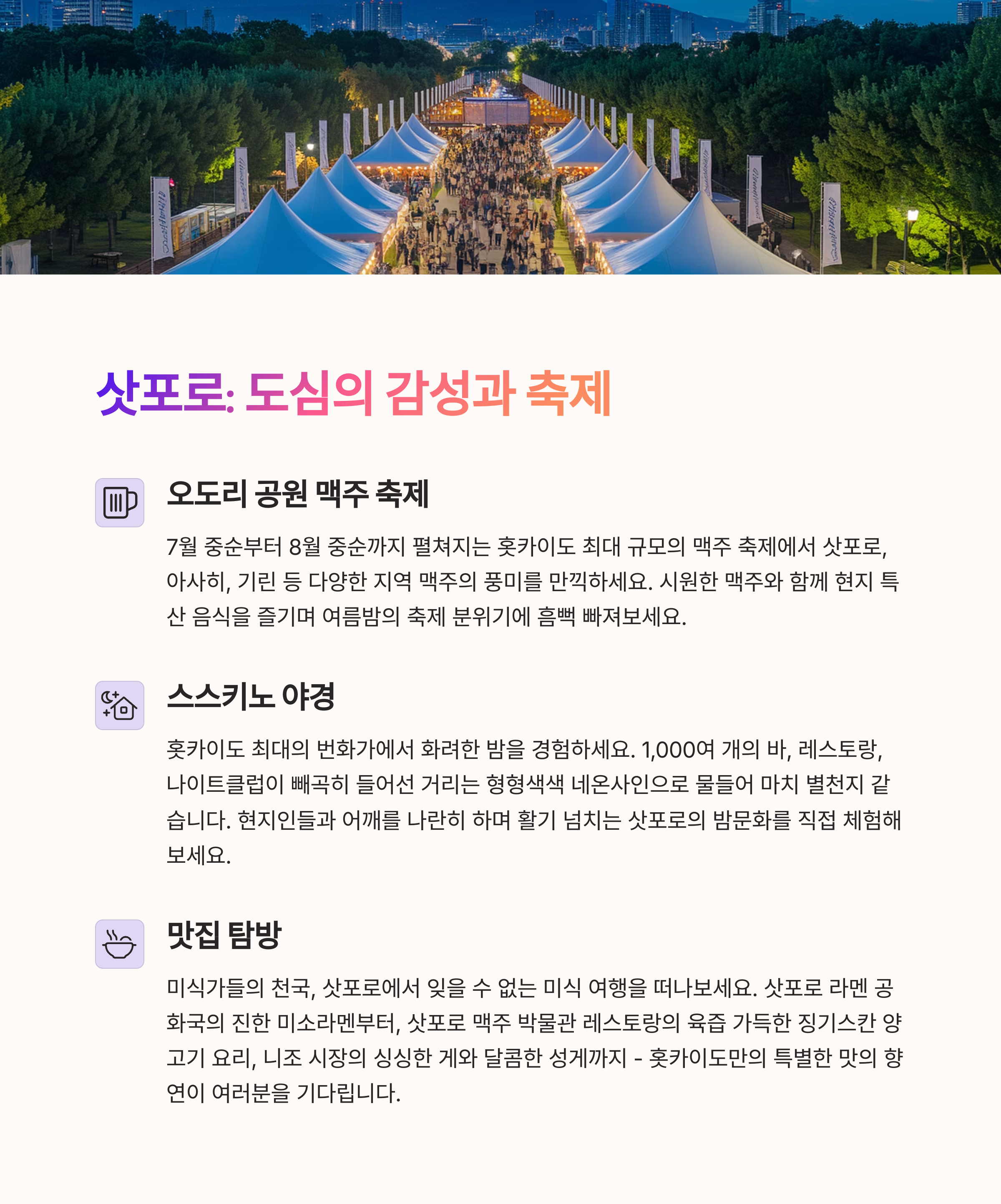 포인트: 대자연과 도시의 여백이 공존하는 삿포로 감성!