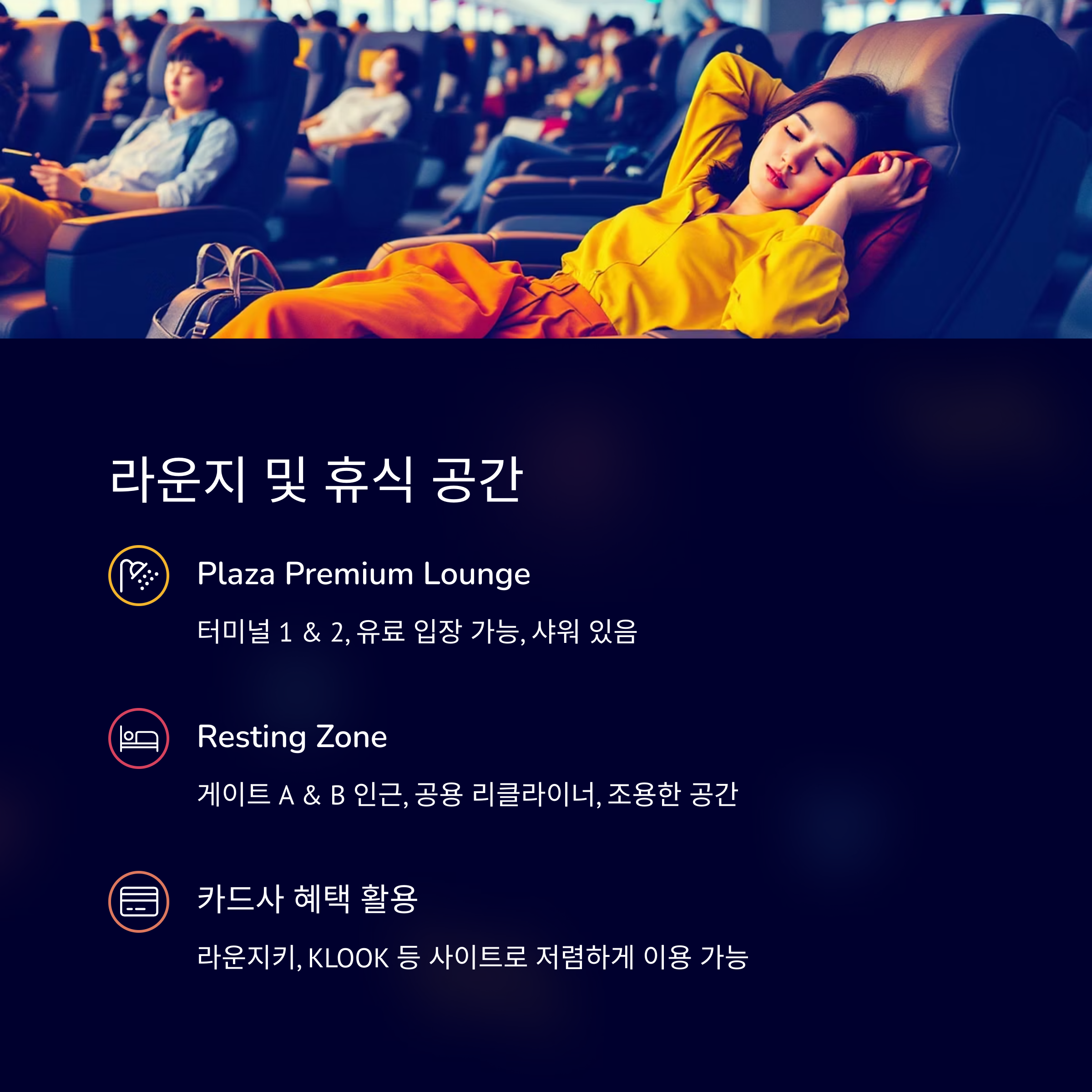 | Resting Zone | 게이트 A & B 인근 | 공용 리클라이너, 조용한 공간 |