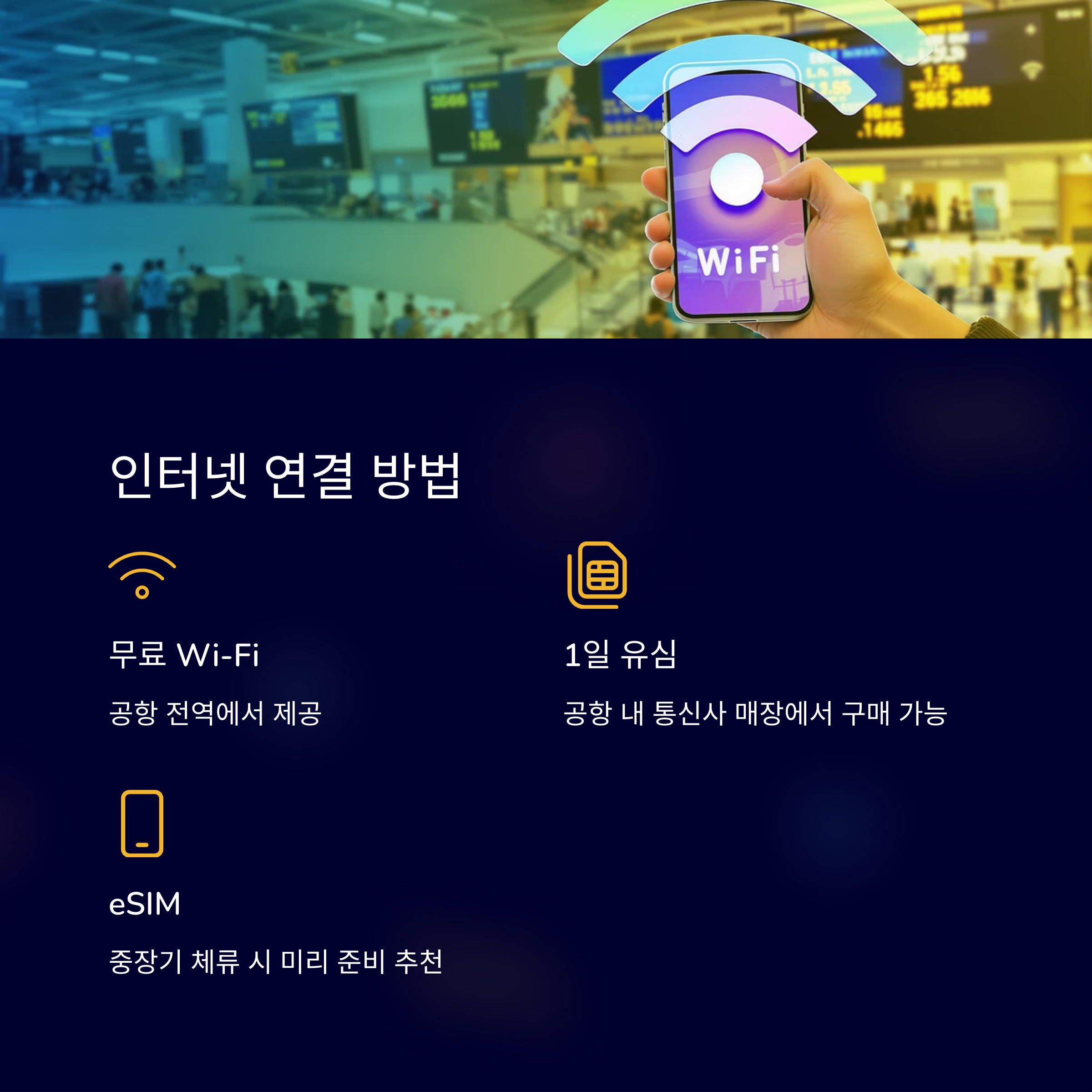 | 무료 Wi-Fi | 공항 전역 | 속도 빠르고 간단한 인증 |