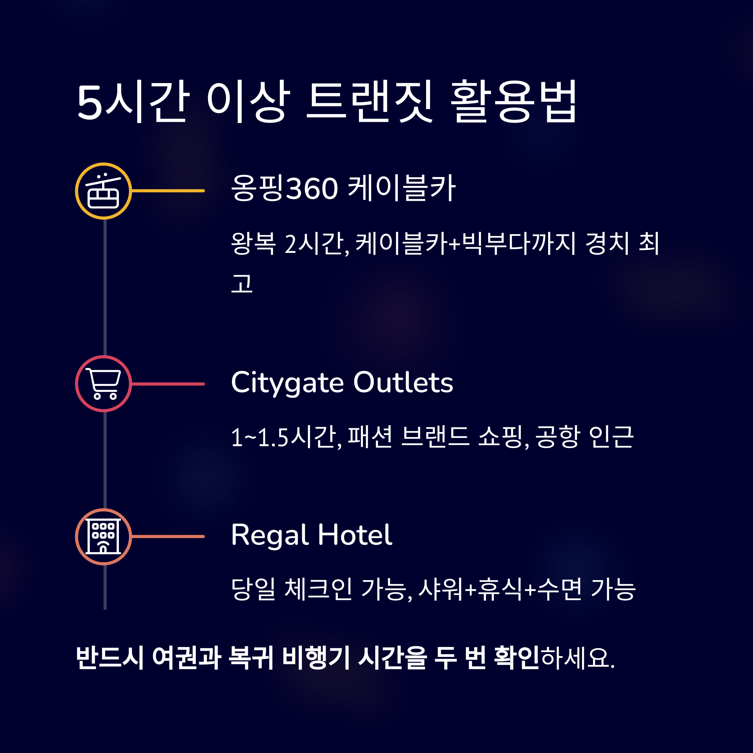다만 홍콩 입국 심사 대기 시간, 복귀 수속 시간까지 포함하면 최소 7시간 이상 여유가 있어야 해요.