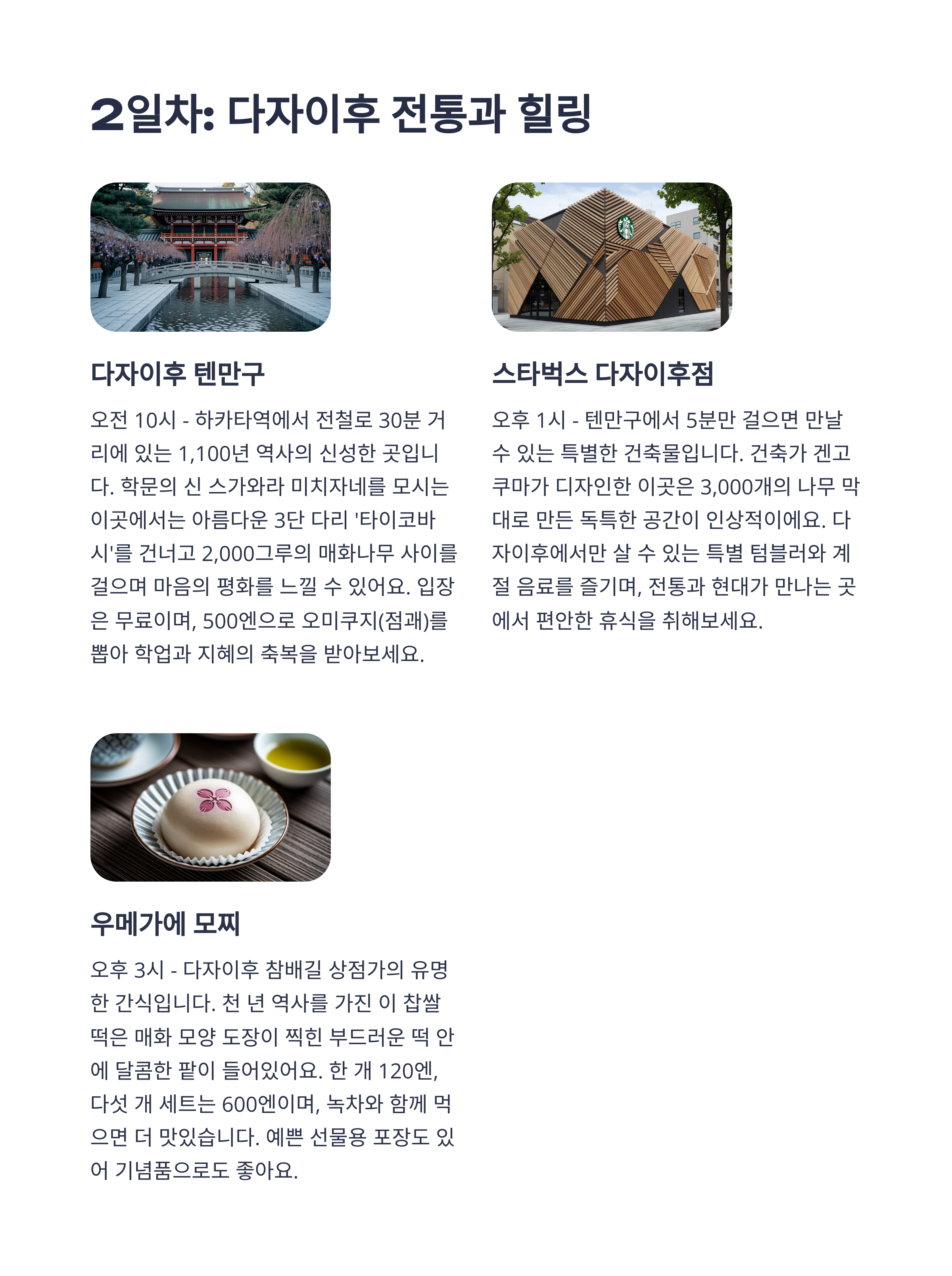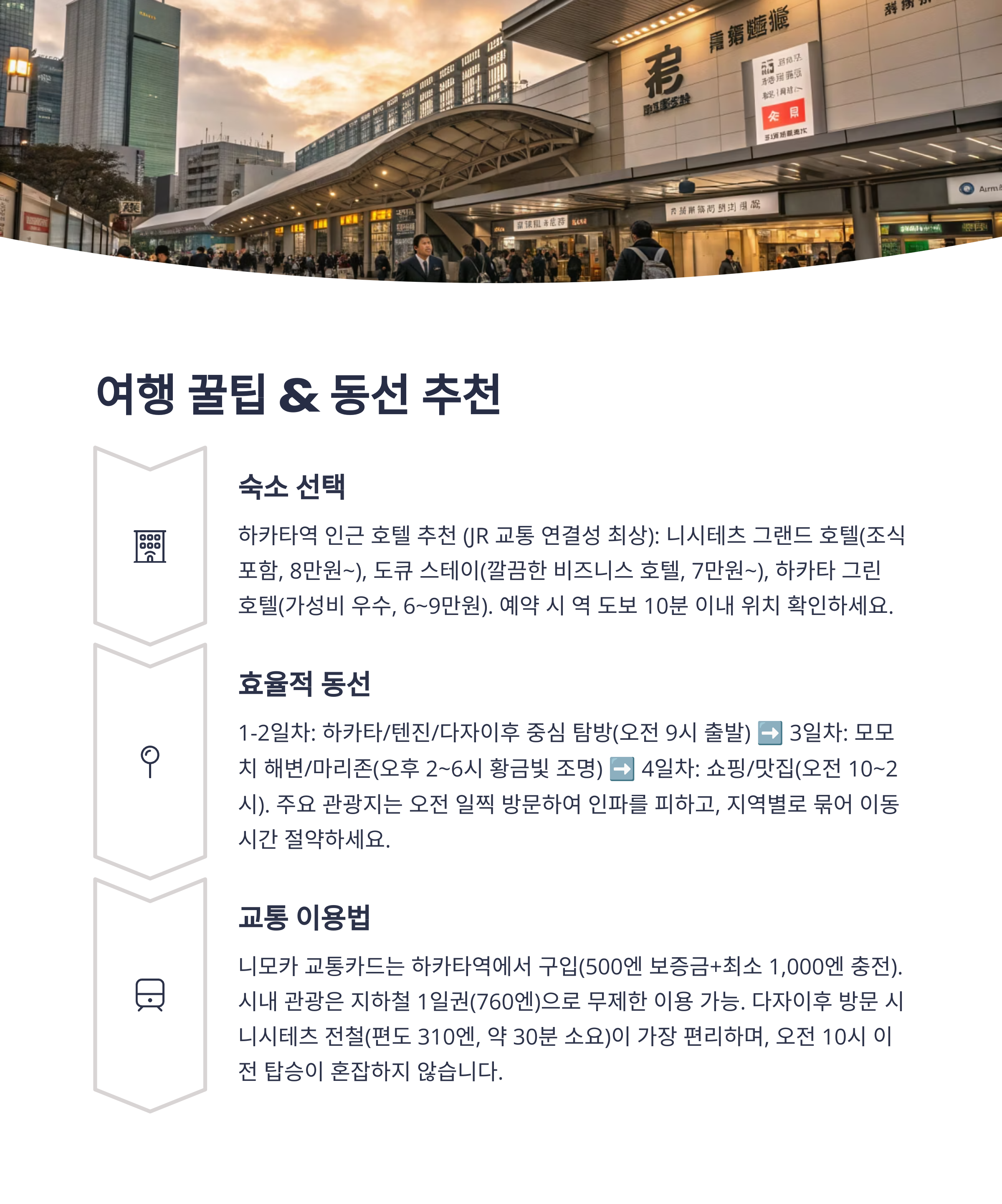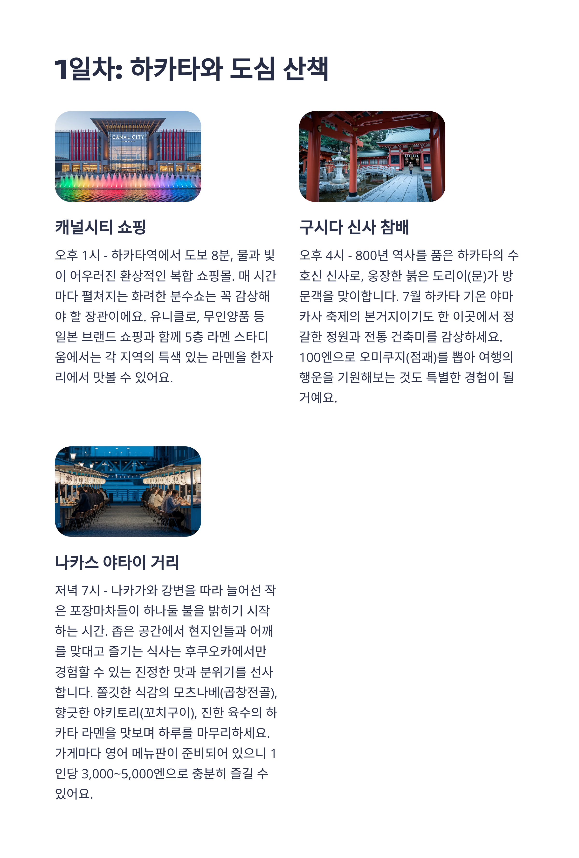 | 일정 구성 | 후쿠오카 시내 중심 숙박 / 다자이후, 모모치, 나카스 당일치기 포함 |