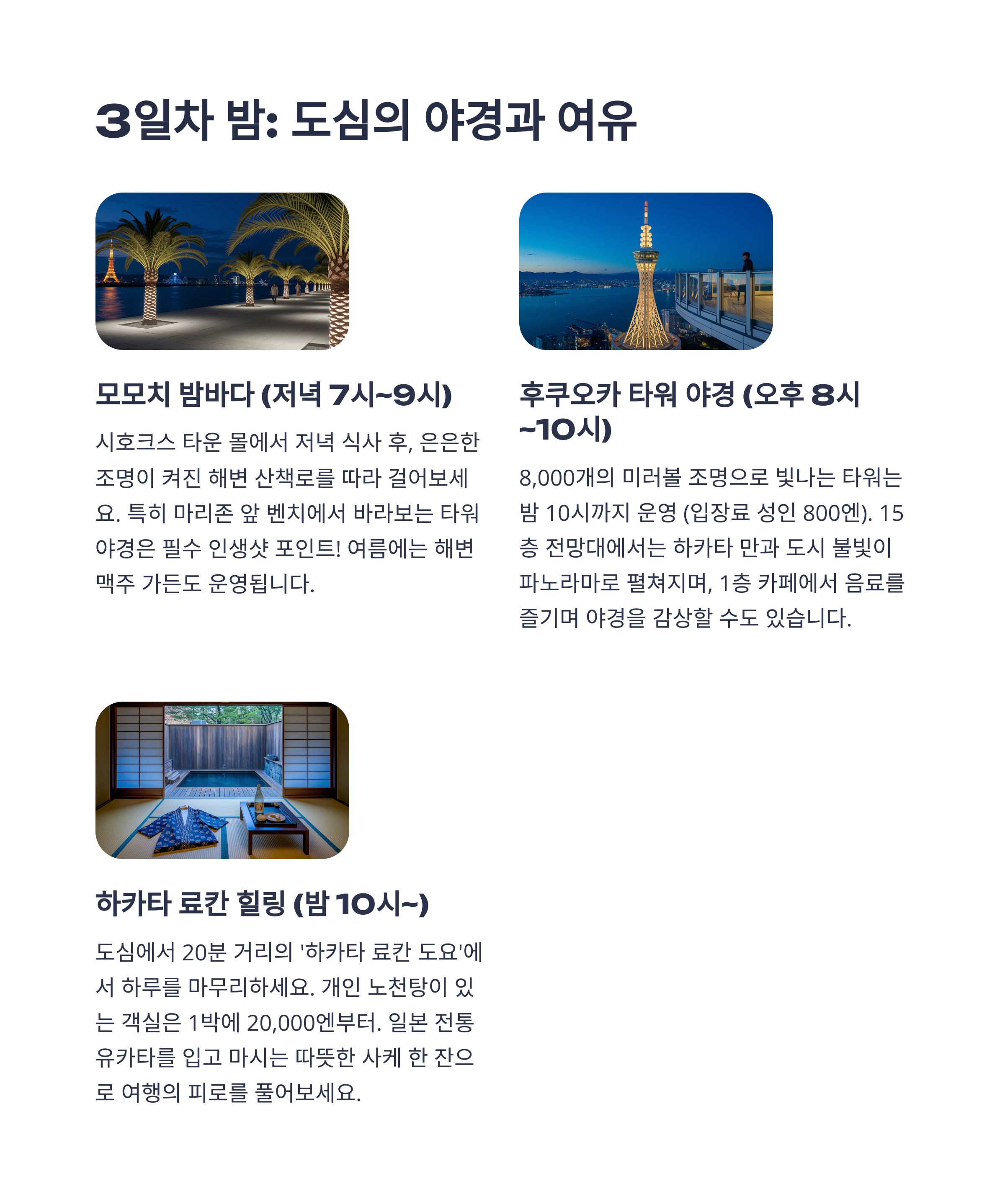 후쿠오카는 조용하지만 따뜻하고, 작지만 충분한 매력을 가진 도시입니다. 다자이후의 나무길과 향기, 모모치 바다의 바람과 파도, 나카스의 밤과 사람들의 소리까지. 이 도시에서는 무언가를 하지 않아도 마음이 채워지는 느낌이 있어요. 가볍게 떠나서 깊은 여운을 남기고 싶은 분께, 후쿠오카는 늘 좋은 선택이 되어줄 거예요.