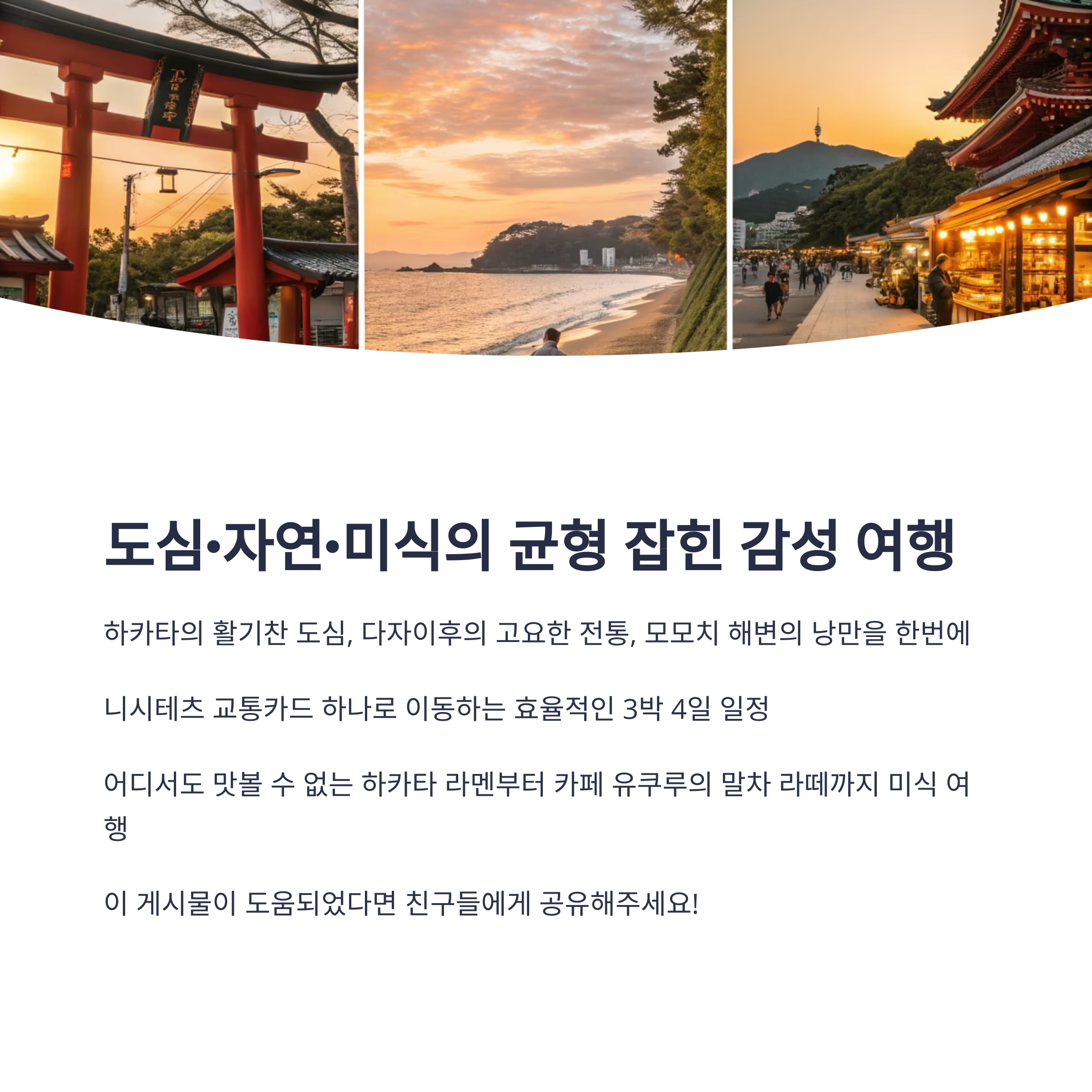 후쿠오카는 비행시간도 짧고, 도시도 작아서 3박 4일이면 충분히 여유롭게 감성 여행을 즐길 수 있는 일본 대표 소도시에요. 오늘 소개할 루트는 고즈넉한 다자이후, 여유로운 모모치 해변, 활기찬 나카스 포장마차까지 감성·힐링·야경이 조화롭게 구성된 루트예요. 혼자 떠나도 좋고, 둘이 가면 더 좋은 따뜻하고 조용한 일본 여행을 찾는 분께 꼭 추천합니다.