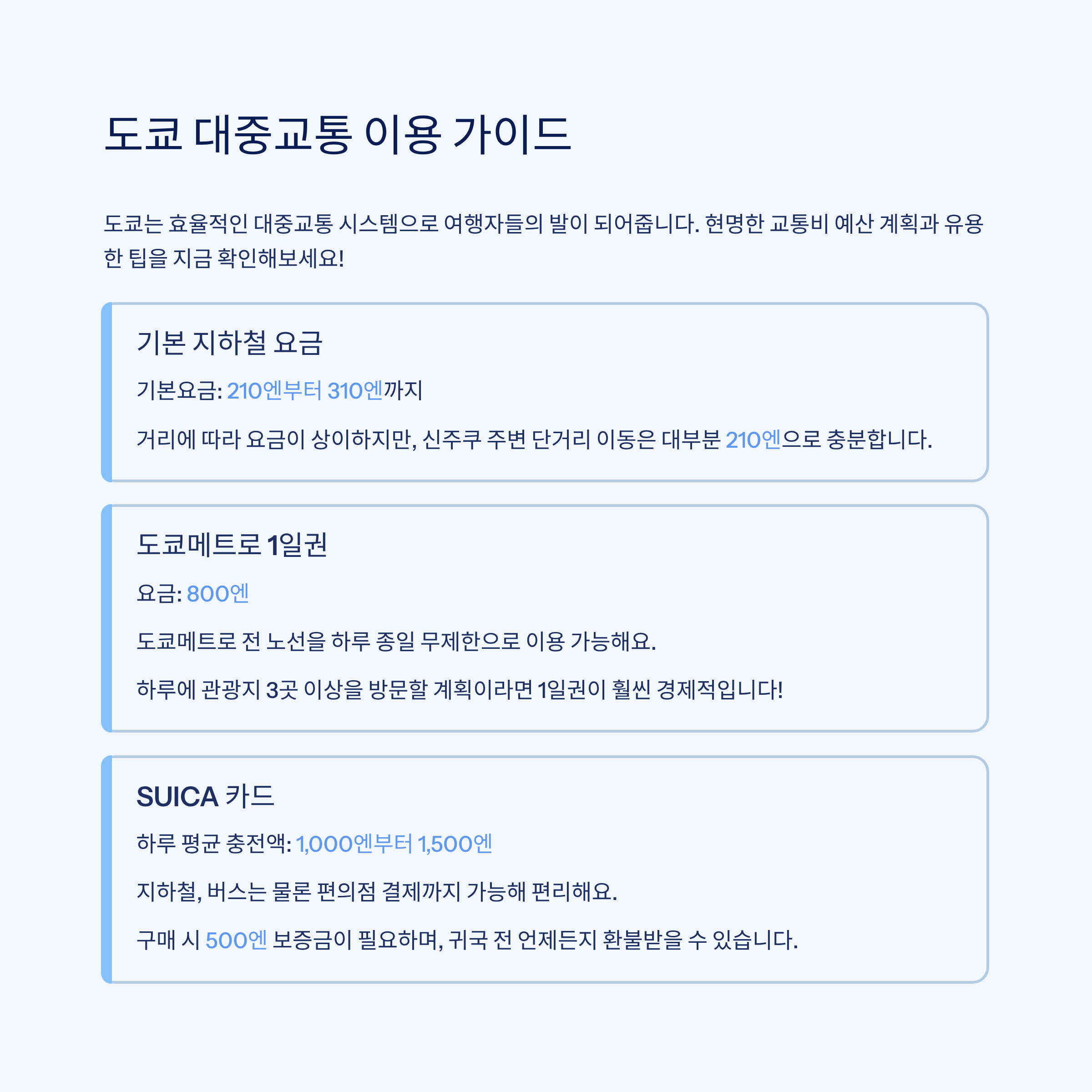 | 기본 지하철 요금 | 210 ~ 310엔 | - |