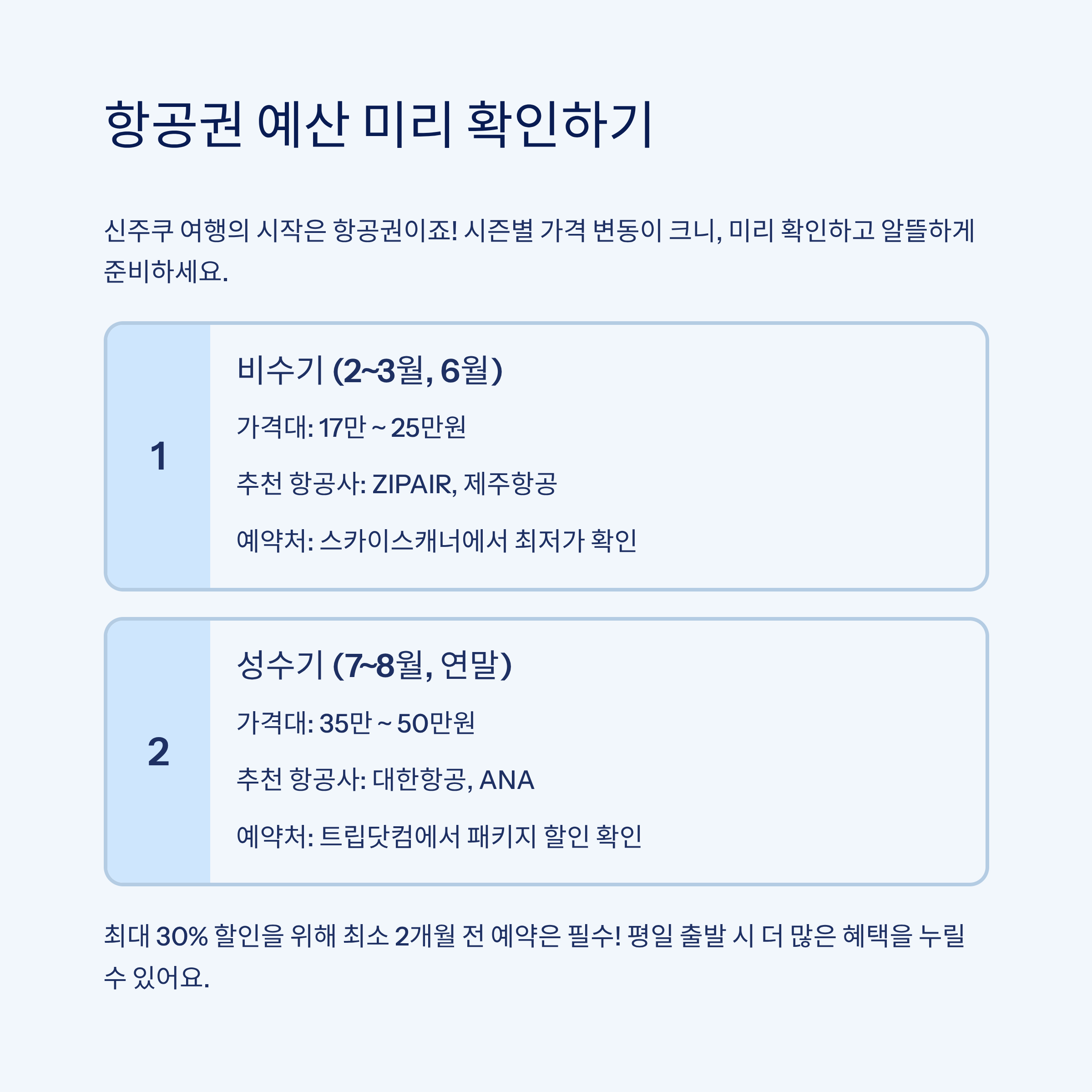 | 비수기 (2~3월, 6월) | 17만 ~ 25만원 | ZIPAIR, 제주항공 등 | 스카이스캐너 |